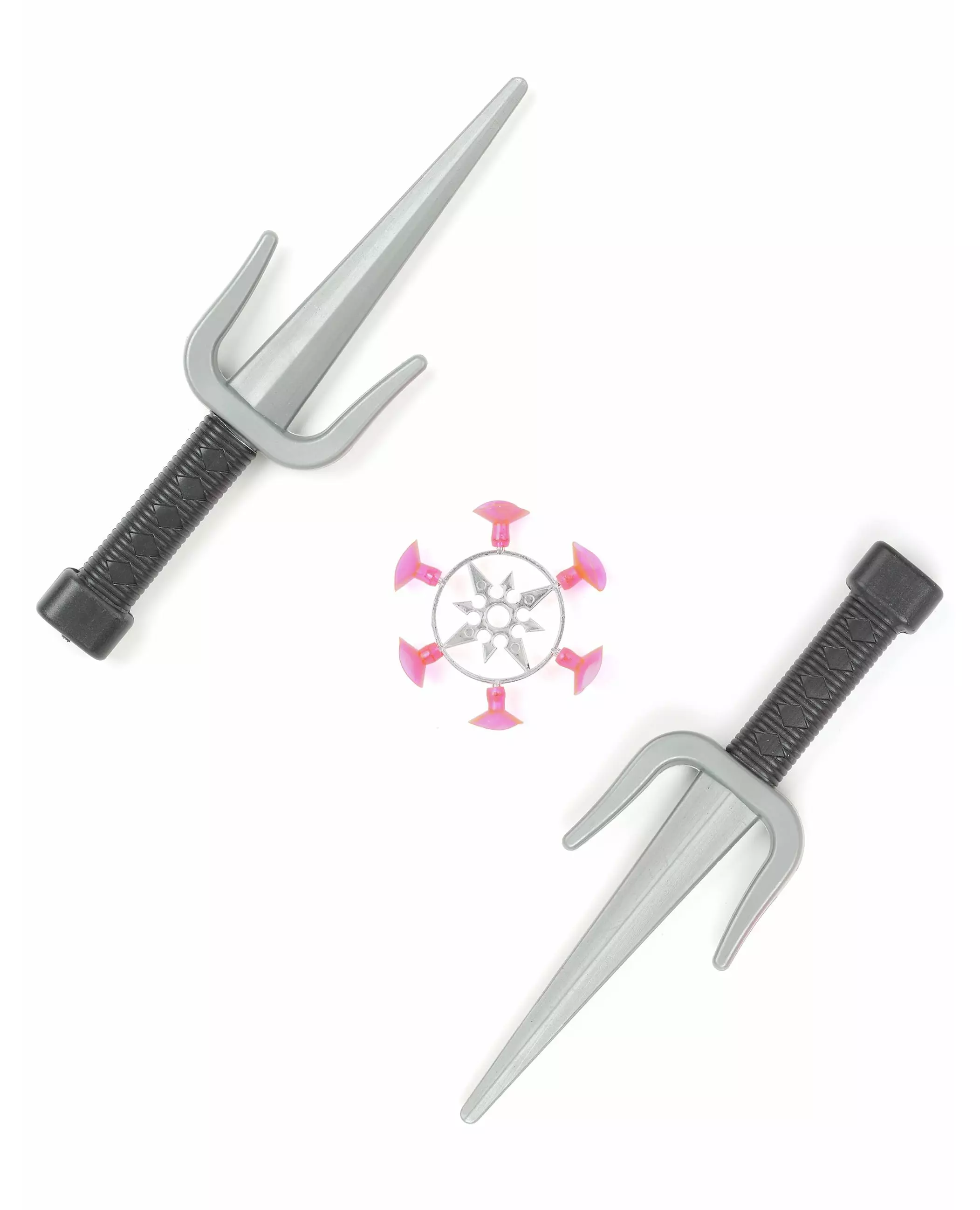 deler! Dette ninja-settet for barn består av to kniver og en stjerne med sugekopper. Knivene er laget av grå plast, og håndtakene er svarte. Stjernen er også laget av grå plast med sugekopper. Dette settet vil være perfekt for å fullføre et ninjakostyme til utkledningsarrangementer. Inkludert tilbehør: Kniver Stjerne Materiale: Plast