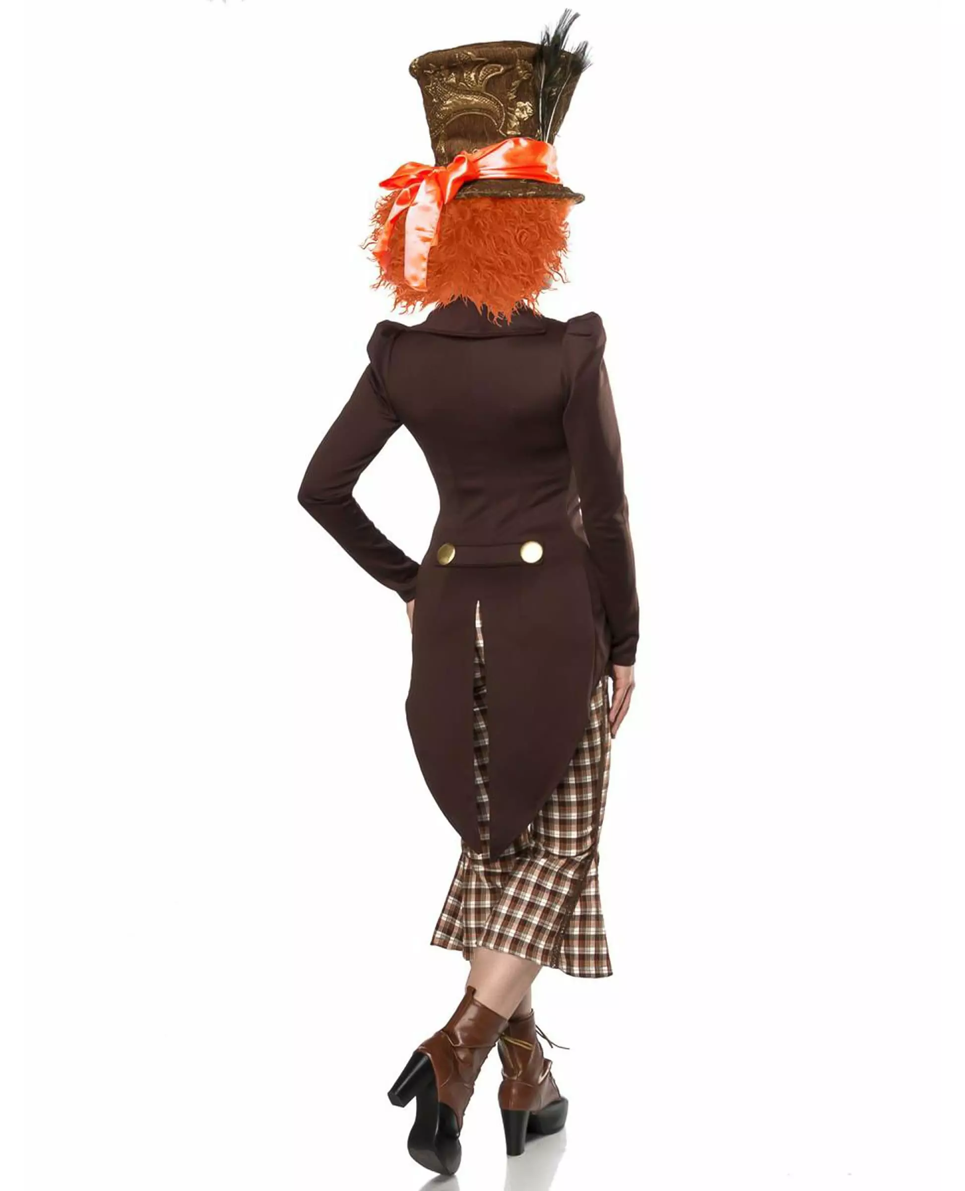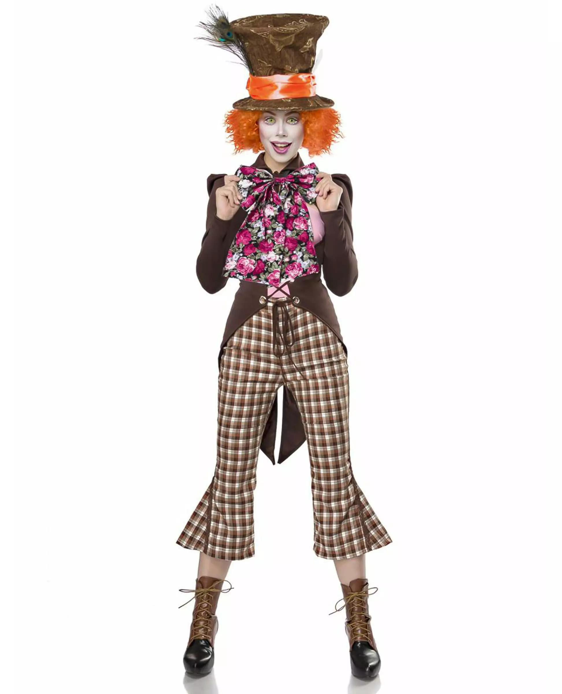En sprø, men så pen hattemaker! Dette luksuriøse, vanvittige hattemakerkostymet er for kvinner. Det består av bukser, topp, jakke, hatt, parykk og sløyfe. Buksene i settet går ned til leggene og kjennetegnes av sin utsvingte effekt på den nedre delen og sitt rutete trykk i brunt og hvitt. Jakken med lange puffermer er brun i fargen, formet som en frakk som går ned til knærne (bakdelen). Festet gjøres foran med en blonder. Den voluminøse, hakelange parykken er oransje med en krusete krølleffekt. Et nett er integrert for å sikre at den holder seg på plass. Over parykken finner du en gammel brun hatt. Den har trykk, en fargerik fjær (klipsfjær) og et oransje pannebånd. Til slutt vil en stor sløyfe gi kostymet et ekstra preg! Gi etter for dette fantastiske settet til Halloween- eller karnevalsfesten din! Tilbehør inkludert: Bukser Topp Jakke Hatt Parykk Sløyfe Materiale: 100 % polyester Vedlikehold: Håndvask