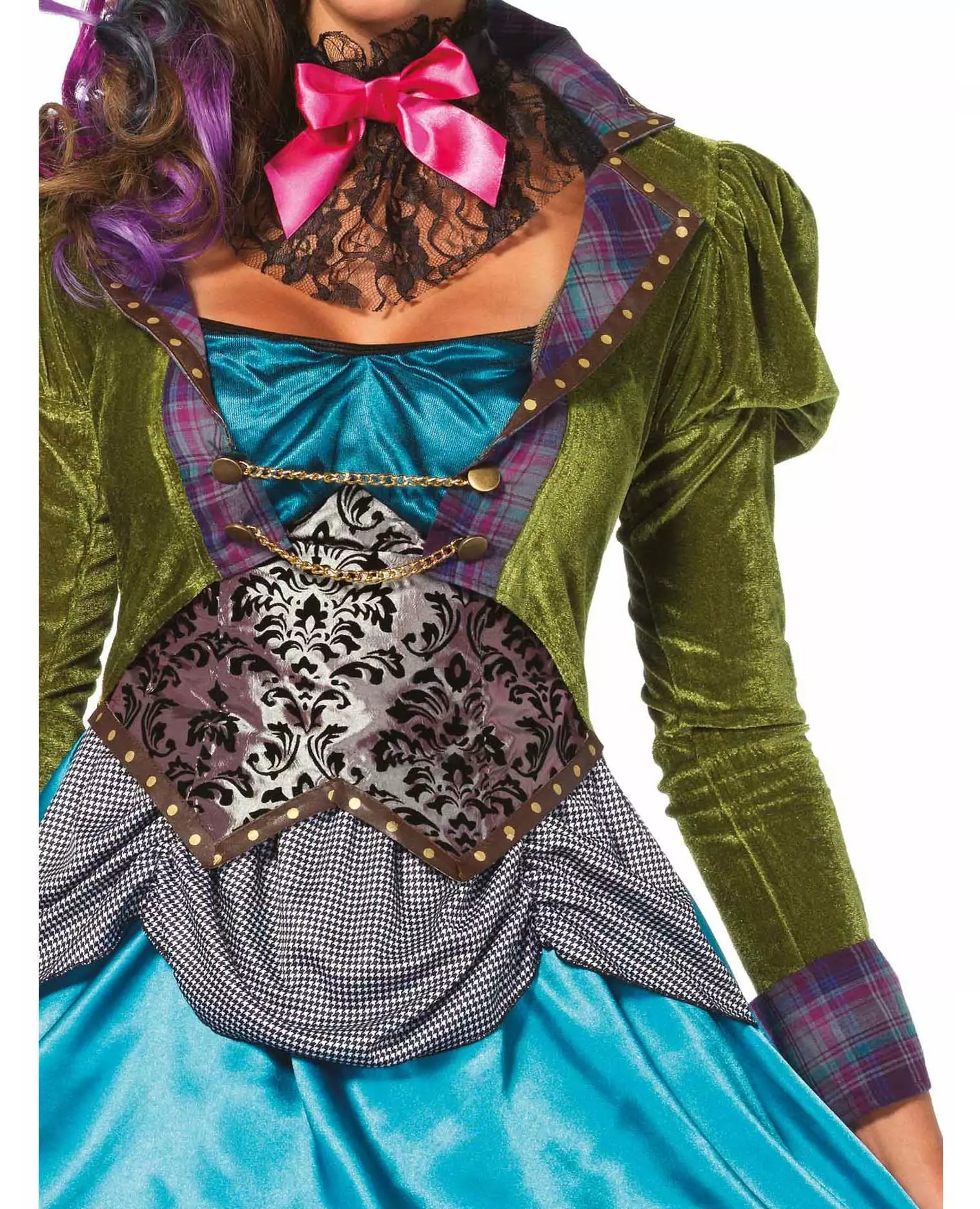 Legemliggjør din favoritt eventyrfigur Dette Mad Hatter-kostymet for kvinner består av en kjole, en hatt og et halskjede (lilla tyllskjørt, hansker, strømpebukser og sko er ikke inkludert). Kjolen er laget av grønt fløyelsstoff på toppen. Det vil gi illusjonen av at du har på deg en cardigan over en blå kjole. Toppen av ermene er puffede. Nederdelen av kjolen er sateng og lengre bak. For å gi kostymet ditt volum, kan du legge til en farget tyllskjørt (ikke inkludert). Denne kjolen lukkes bak med glidelås. Den lille flosshatten i skum har to løkker, som kan brukes med hårnåler for å feste hatten. En klokke med kile er vist i stoffet på forsiden. Kragen er en svart sateng-choker. Den er dekorert med en rosa sløyfe og svart blonder. Den lukkes med borrelås. Dette sexy Mad Hatter-kostymet vil være perfekt for karneval eller en utkledningsfest med venner. Inkludert tilbehør: Dress Hat Halskjede Materiale: 100 % polyester Pleie: Håndvask