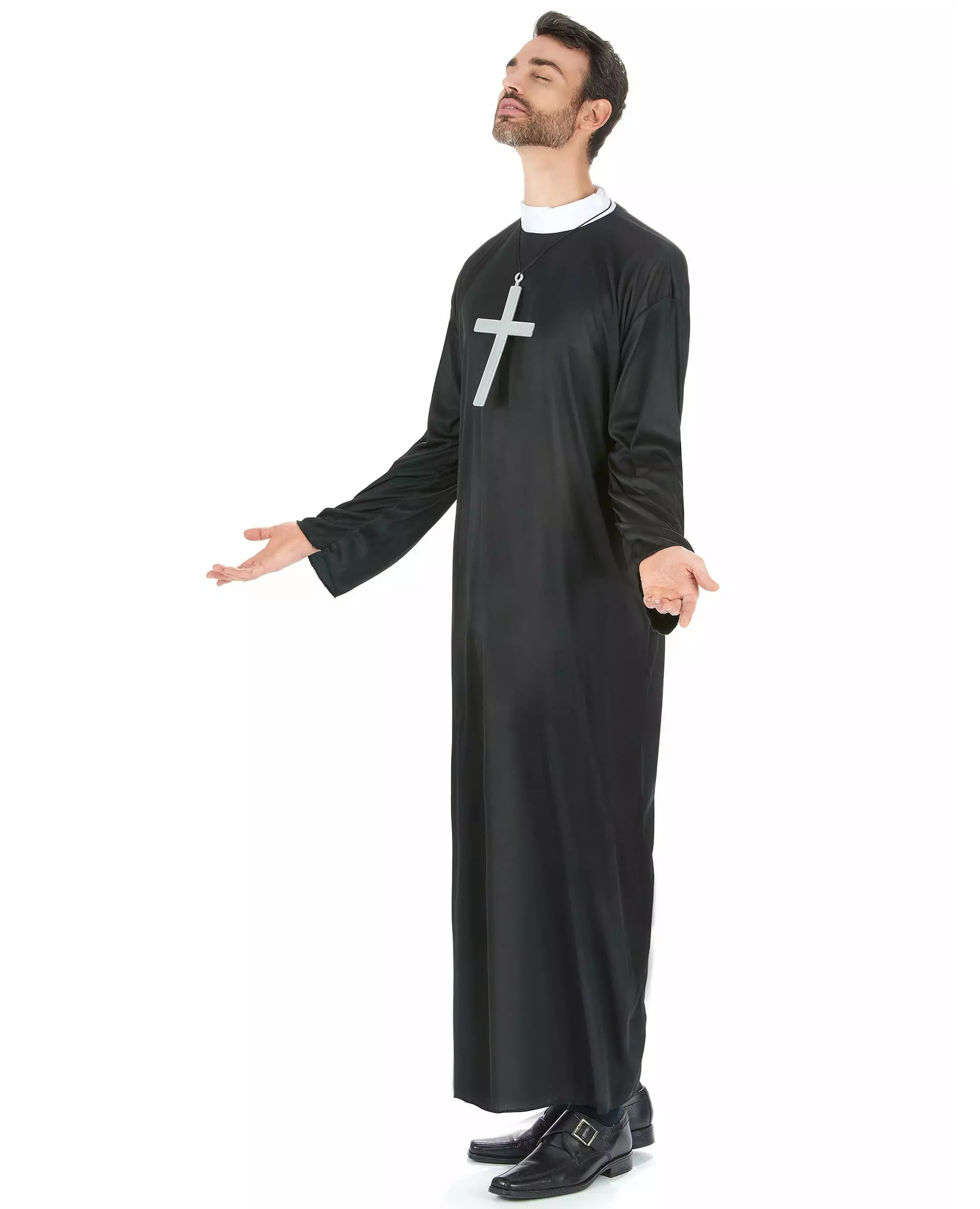 Bli prest til en utkledningsfest Dette prestekostymet i stor størrelse er for menn. Det består av en kjole (halskjede og bok er ikke inkludert). Den lange kjolen er svart med hvit krage. Det er borrelås øverst på ryggen for enkel lukking av kjolen. Dette kostymet vil være perfekt for karneval eller en utkledningsfest med venner. Inkludert tilbehør: Kjole Materiale: 100 % polyester Pleie: Håndvask