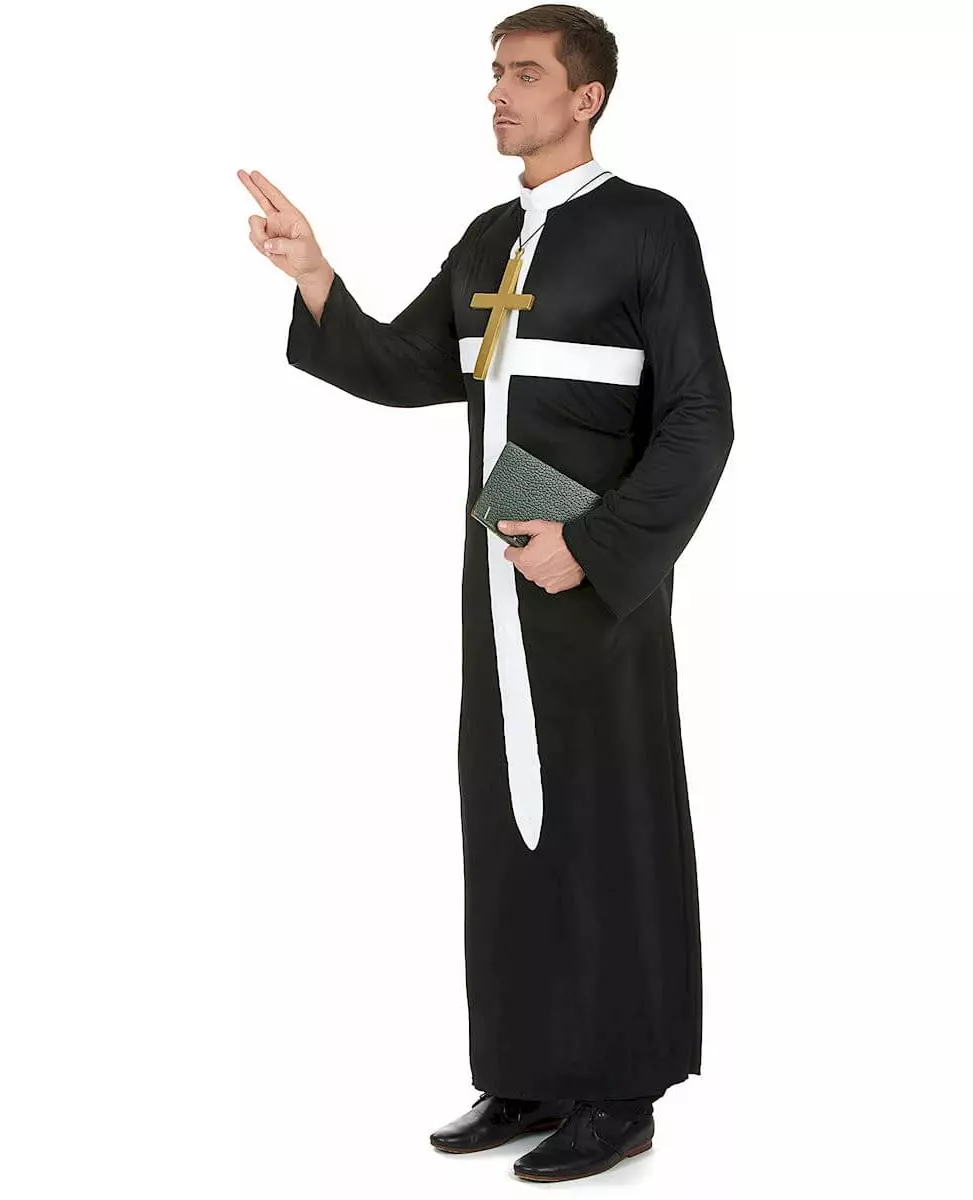Forkynn det gode ord Dette prestekostymet for menn inkluderer en lang svart kappe med vide ermer. Kragen er hvit og forlenget av et stort hvitt kors. (gullkors ikke inkludert). Settet vil være veldig komfortabelt for å spille religiøst på et kostymefest eller et utdrikningslag!. Inkludert tilbehør: Kappe Materiale: 100 % polyester Stell: Håndvaskbar