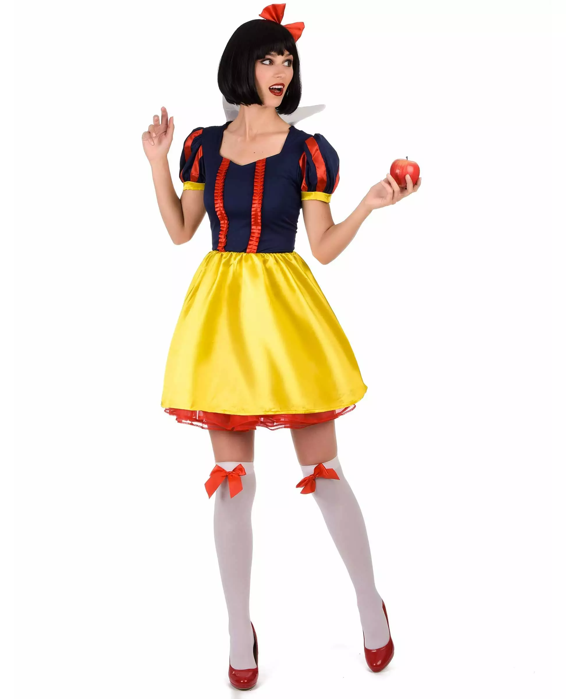Ikke bit i eplet! Dette Prinsesse av de 7 dvergene-kostymet for kvinner tilbyr deg en veldig pen kort kjole (eple, strømper, sko, parykk, underskjørt og sløyfe er ikke inkludert). Kjolen med korte, puffermer er marineblå ved bysten og har en samlet rød satengflette foran. Ermene er kantet med et skinnende gult stoff og stripete i rødt. Støtten sikres med borrelås og vil tillate opprettholdelse av en halvstiv hvit satengkrage. Midjen er elastisk for din komfort og strekker seg til et skjørt i en vakker gulfarge med satenginstrek. Til karnevalsfesten eller en eventyrlig prinsessetemafest vil dette sexy kostymet være perfekt! Inkludert tilbehør: Kjole Materiale: 100 % polyester Stell: Håndvaskbar