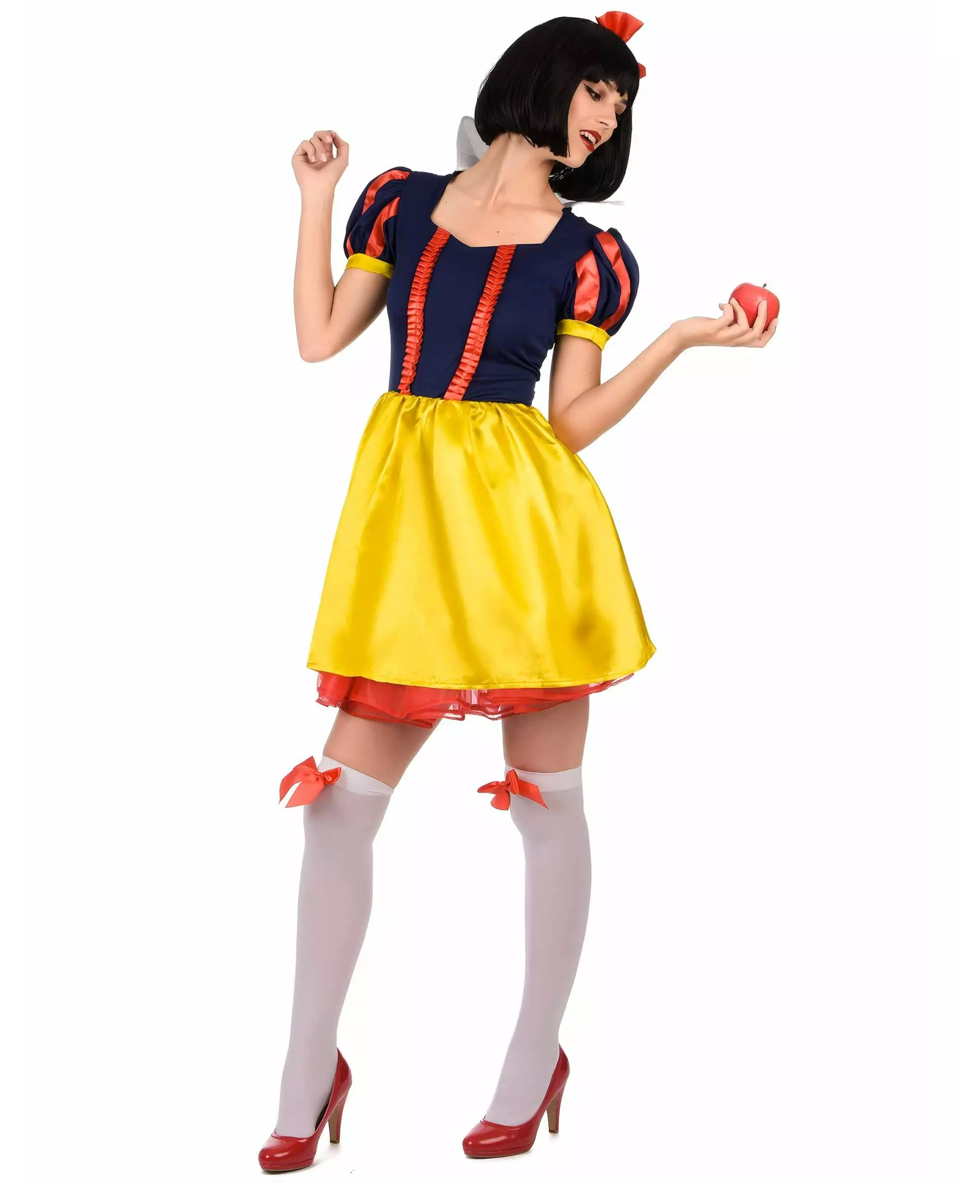 Ikke bit i eplet! Dette Prinsesse av de 7 dvergene-kostymet for kvinner tilbyr deg en veldig pen kort kjole (eple, strømper, sko, parykk, underskjørt og sløyfe er ikke inkludert). Kjolen med korte, puffermer er marineblå ved bysten og har en samlet rød satengflette foran. Ermene er kantet med et skinnende gult stoff og stripete i rødt. Støtten sikres med borrelås og vil tillate opprettholdelse av en halvstiv hvit satengkrage. Midjen er elastisk for din komfort og strekker seg til et skjørt i en vakker gulfarge med satenginstrek. Til karnevalsfesten eller en eventyrlig prinsessetemafest vil dette sexy kostymet være perfekt! Inkludert tilbehør: Kjole Materiale: 100 % polyester Stell: Håndvaskbar