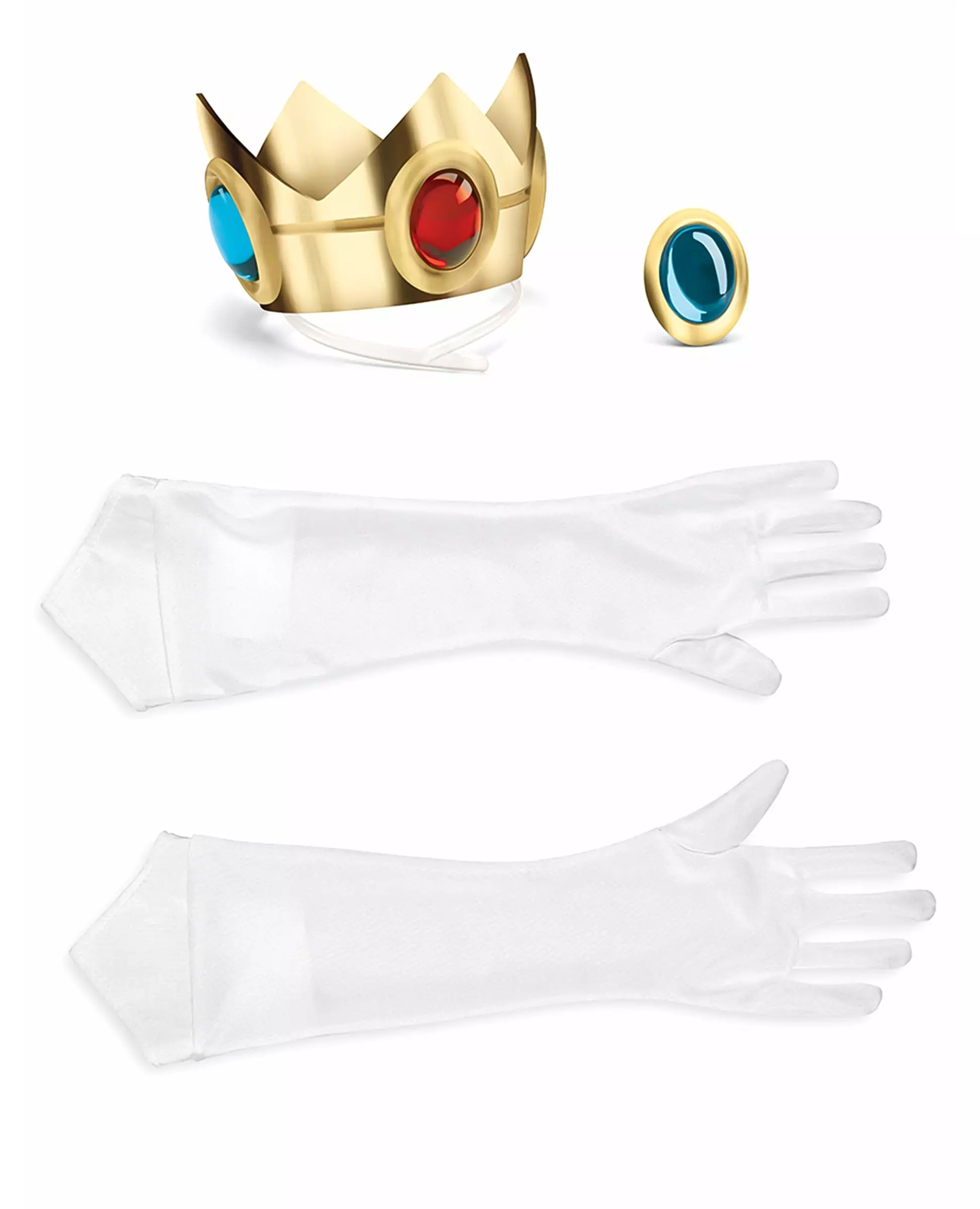 Bli med Mario og Luigi på deres vanvittige eventyr! Dette Princess Peach™-tilbehørssettet er offisielt lisensiert av Mario™. Det inkluderer et hodeplagg, et par hansker og en falsk medaljong. Prinsesse Peachs krone er laget av hardplast. Den er dekorert med falske røde og blå edelstener. Den er festet til et gjennomsiktig plastpannebånd. De lange hanskene er hvite. De danner en spiss i enden. Den falske medaljongen, laget av hardplast, representerer en falsk blå edelsten. Den er selvklebende og kan festes til kostymet ditt. Den måler omtrent 6 x 4,5 cm. Dette tilbehøret lar deg forvandle deg til Peach™, din favorittprinsesse. Inkludert tilbehør: Hodeplagg 2 hansker Medaljong