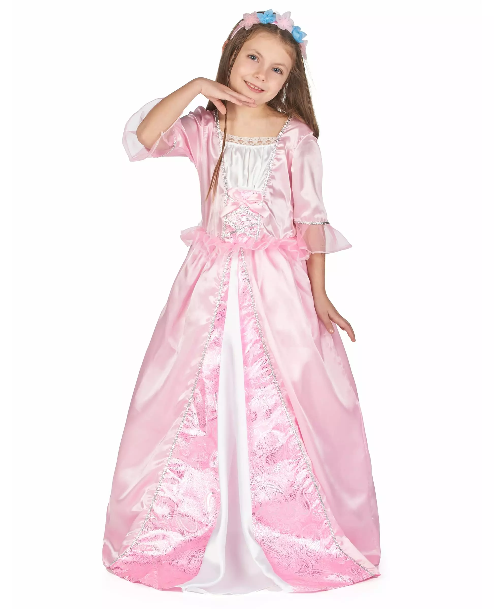 Broderi og blondedetaljer! Dette prinsessekostymet for jenter består av en kjole og et pannebånd (bøyleunderskjørt ikke inkludert). Denne satengrosa kjolen er dekorert med sølvkant og svært elegant blonde. Den er utsmykket med blonder på toppen og fine rysjer. Antrekket inkluderer også et pannebånd med rosa og himmelblå slørblomster sydd på. Dette prinsessekostymet vil ta datteren din med til drømmeland for en bursdagsfest, et show eller et karneval!. Inkludert tilbehør: Kjolepannebånd Materiale: 100 % polyester Vedlikehold: Renseri