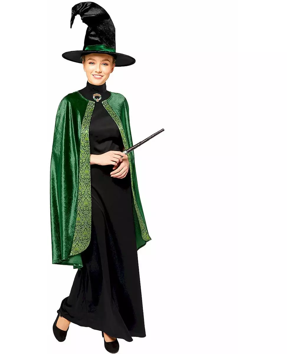 Legemliggjør den kloke og mektige rektor på Galtvort™! Dette kostymet representerer den berømte professor McSnurp fra Harry Potter-universet og inkluderer en kjole med kappe og hatt. Kjolen, som er helt svart, kjennetegnes av sin høye krage og lange snitt, og gir et elegant utseende samtidig som den dekker bena. McSnurps umiskjennelige medaljong er plassert ved halsen og gir et autentisk preg. Antrekket er pyntet med en grønn kappe dekorert med skotske mønstre, en nikk til karakterens opprinnelse. Hatten, dekorert med et grønt bånd, fullfører dette ikoniske kostymet, ideelt for å legemliggjøre den mektige rektor på Galtvort. Dette kostymet er perfekt for karneval eller en Harry Potter-temafest! Materiale: Polyester. Inkludert tilbehør: Kjole med kappe.
