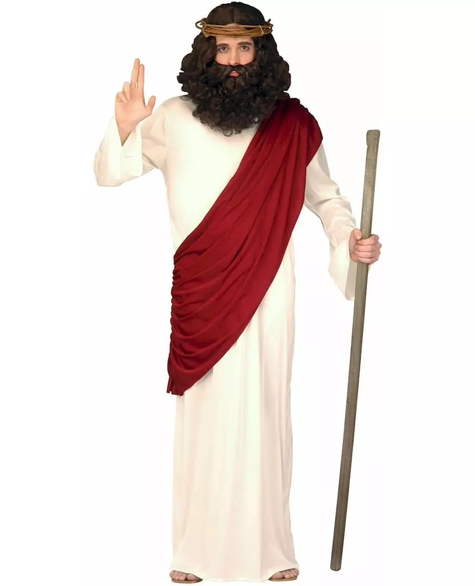 Trekrone inkludert! Dette profetkostymet for menn består av en lang hvit tunika, en burgunderrød kappe og en trekrone. Togaen er sydd fast på kostymet (pinne ikke inkludert). Dette kostymet vil gjøre deg til kommentator for gode eller dårlige spådommer under karneval eller andre utkledningsarrangementer. ©Copyright Widmann SRL. Inkludert tilbehør: Tunika Skjerf Krone Materiale: 100 % polyester Vedlikehold: Håndvask