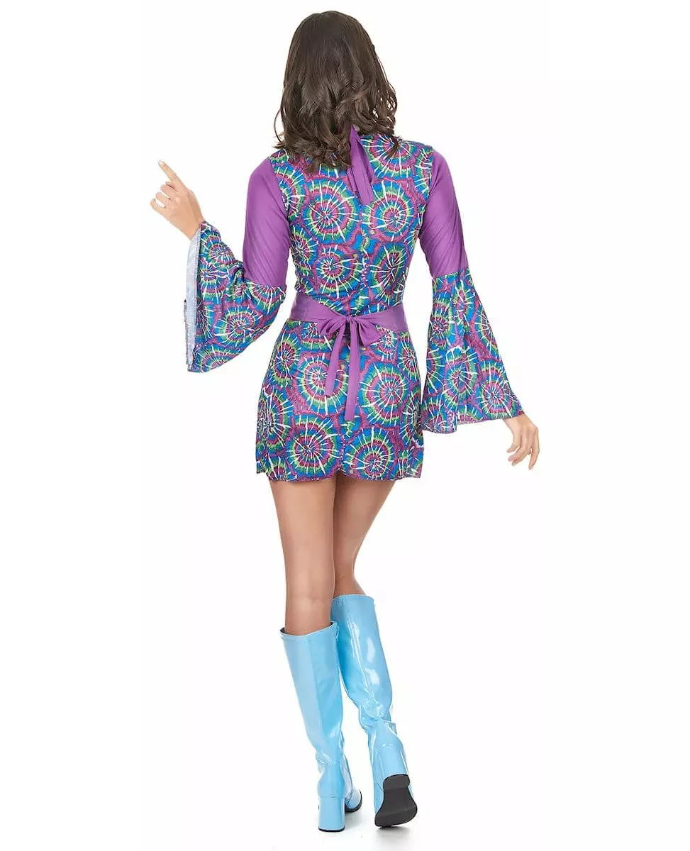 Gjenopplev 60-tallet Dette kostymet for voksne illustrerer antrekket som Baba Cool bruker. Det inkluderer en kjole, et belte og et hårbånd (sko ikke inkludert). Kjolen er laget av polyester. I nyanser av lilla og blått har den psykedeliske mønstre. Ermene er tettsittende på armene og er utsvingt fra albuen til håndleddet. Et lilla belte dekorert med en hvit plastspenne formet som en blomst med en diameter på 8 cm fremhever elegant midjen. Hårbåndet er lilla. Laget av polyester, det er langt nok til å gå rundt hodet og la endene falle til sidene. Det måler 128 x 9 cm. På en temafest kan du være kul med dette typiske 60-tallsantrekket. Inkludert tilbehør: Kjolebelte Pannebånd Materiale: 100 % polyester Pleie: Håndvask