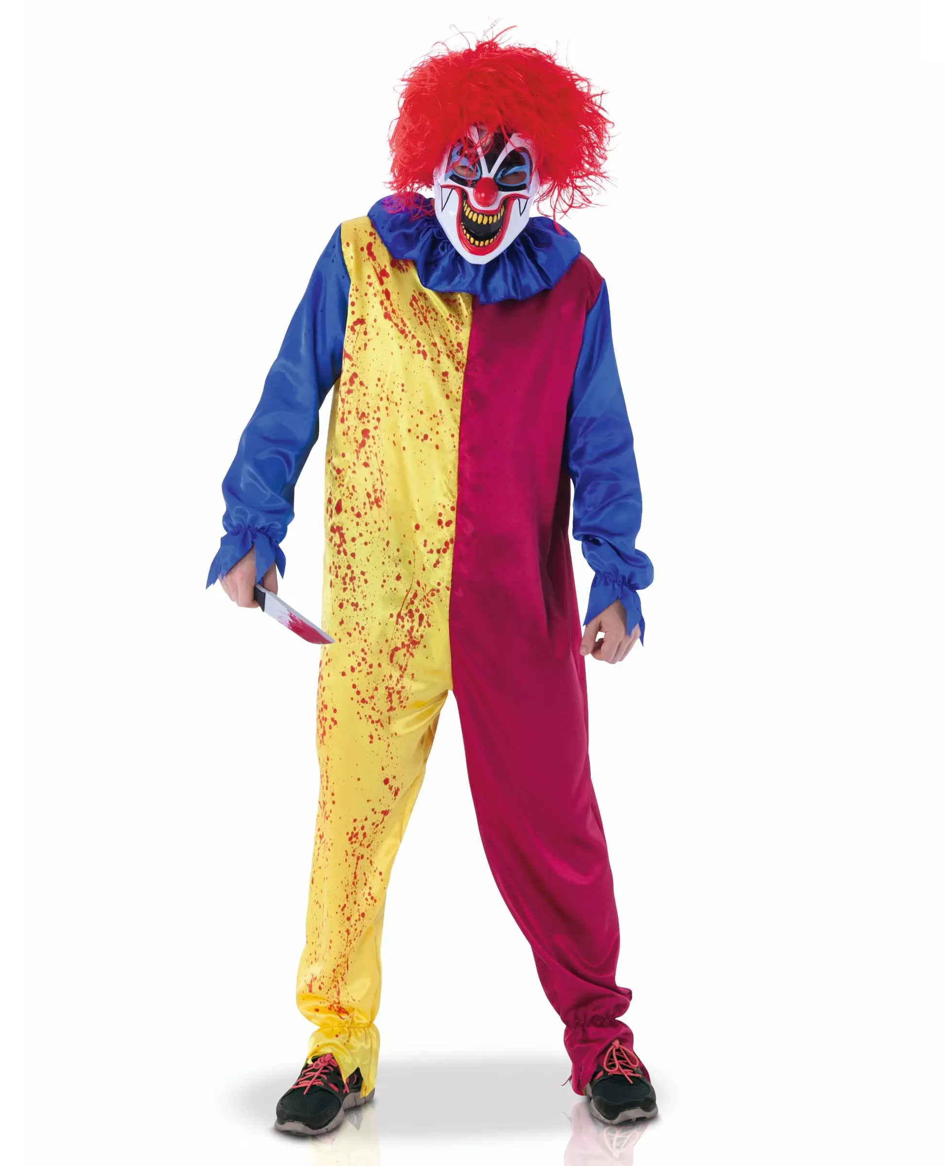 En ond klovn! Dette psykopatiske klovnekostymet består av en jumpsuit og en maske (kniv, parykk og sko er ikke inkludert). Jumpsuiten har én gul side trykt med falske blodflekker og én rød side. Ermene og kragen på jumpsuiten er blå. En maske som forestiller et klovneansikt fullfører denne jumpsuiten. Dette settet for voksne vil være perfekt for å skremme vennene dine på en Halloween-fest! Inkludert tilbehør: Jumpsuit-maske Materiale: 100 % polyester Vedlikehold: Håndvask