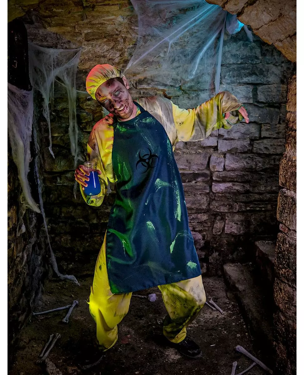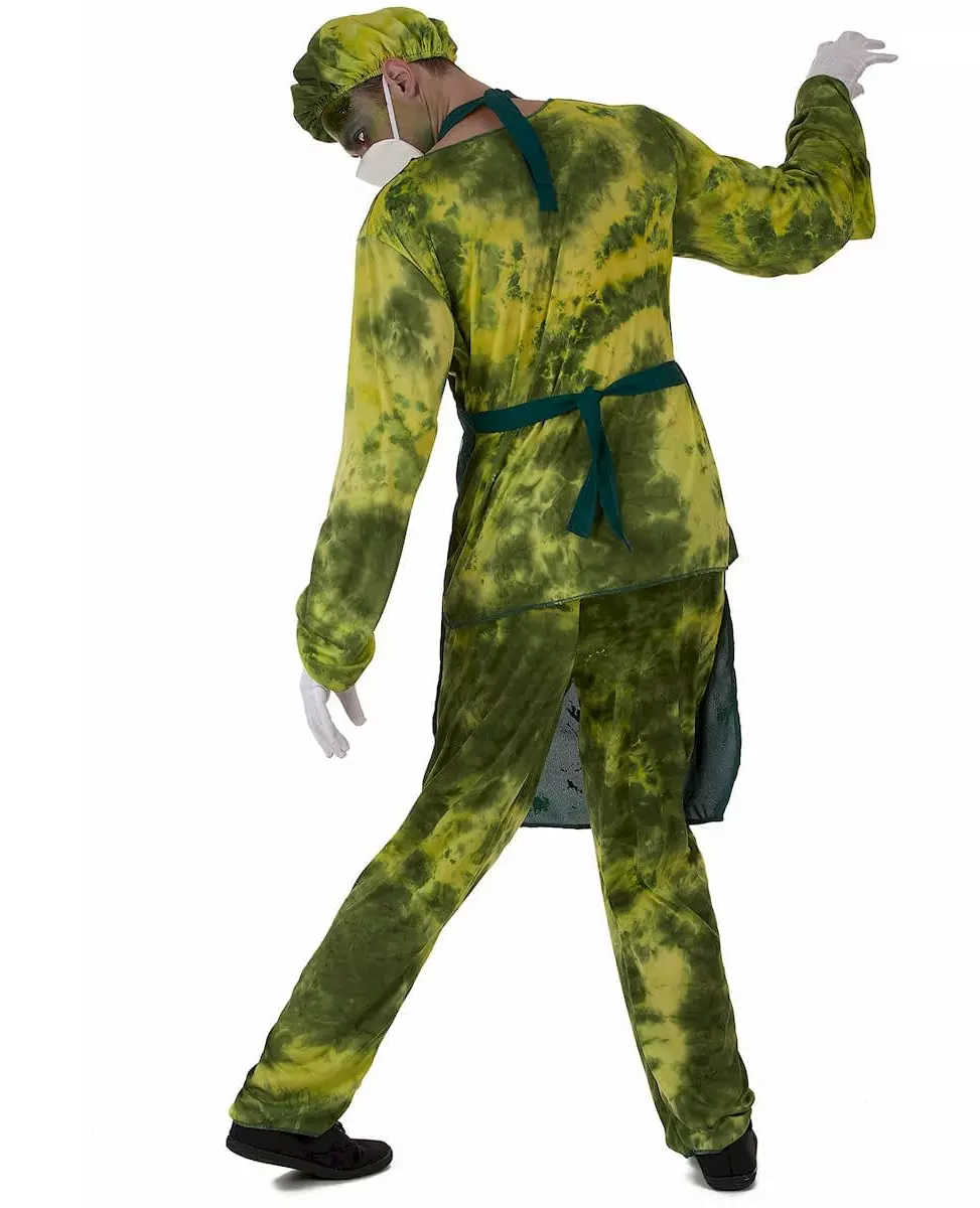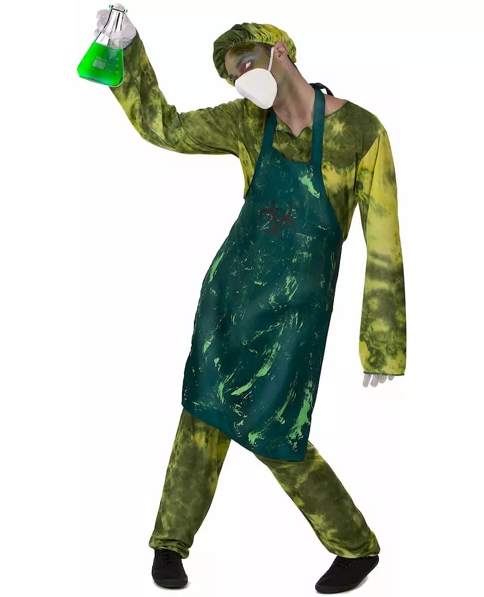 En feil i doseringen.... Dette radioaktive kirurgkostymet for menn inkluderer en t-skjorte, bukser, et forkle, en maske og et hodeplagg. Toppen, hodeplagget og buksene, laget av mykt stoff, er grønne. Trykket fremkaller et stoff farget med lys og mørkegrønt. Forkleet, laget av tykkere stoff, er mørkegrønt farget med fluorescerende grønt falskt blod. Det festes bak nakken og rundt midjen. Piktogrammet "Biologisk fare" er flokket i svart på overkroppen. Masken består av et stykke hvitt skum som plasseres foran munnen din og holdes på plass av en hvit strikk. Dette settet vil garantert skremme vennene dine på en kostymefest eller på karneval. Inkludert tilbehør: T-skjorte Bukser Forkle Charlotte-maske Materiale: 100 % polyester
