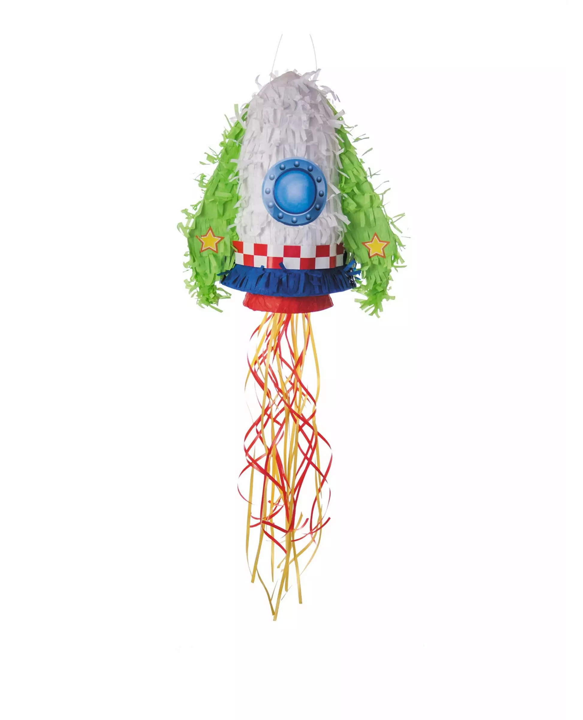 For en romfartsfan, bør du vurdere rakettpiñataen. Denne piñataen er formet som en rakett. Den er dekorert med hvite, røde og gule frynser. Den måler omtrent 45 x 32 x 15 cm. Leveres tom, har den en åpning slik at du kan fylle den med godteri og små gaver. Et håndtak lar deg også enkelt henge den opp. Denne rakettpiñataen vil være perfekt for å live opp en bursdagsfest. Inkludert tilbehør: Piñata Materiale: Papp