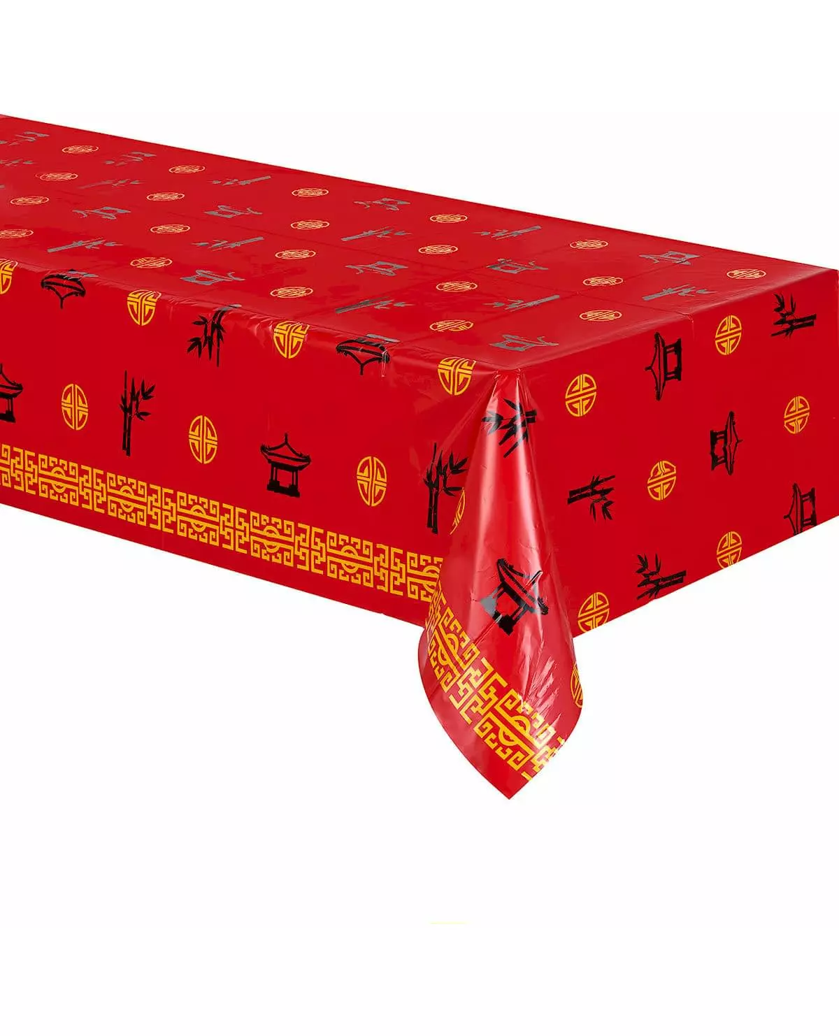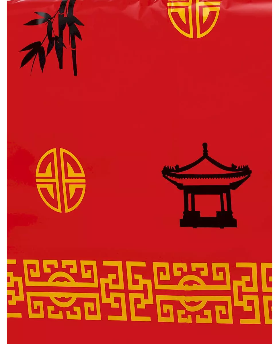 Din allierte for et asiatisk temamåltid! Denne duken med asiatisk tema måler omtrent 137 x 274 cm. Den er rød og har gule mønstrede striper på de to lengste sidene. Du finner også asiatiske mønstre i gult og svart gjennom hele duken. For å organisere en temafest, eller tilberede et godt måltid med venner eller familie med asiatisk tema, vil denne duken være din allierte! Inkludert tilbehør: 1 duk Stell: Håndvask