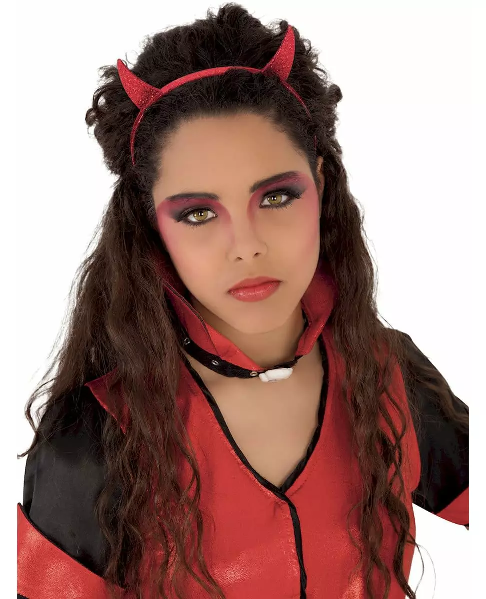 Et djevelpannebånd for jenter! Dette djevelpannebåndet for jenter selges uten topp og halskjede. Det er helt rødt og har to små paljettbesatte djevelhorn. Dette paljettpannebåndet vil være perfekt for å fullføre ditt lille djevelkostyme til en utkledningsfest, eller bare til Halloween. Materiale: PVC. Inkludert tilbehør: Pannebånd