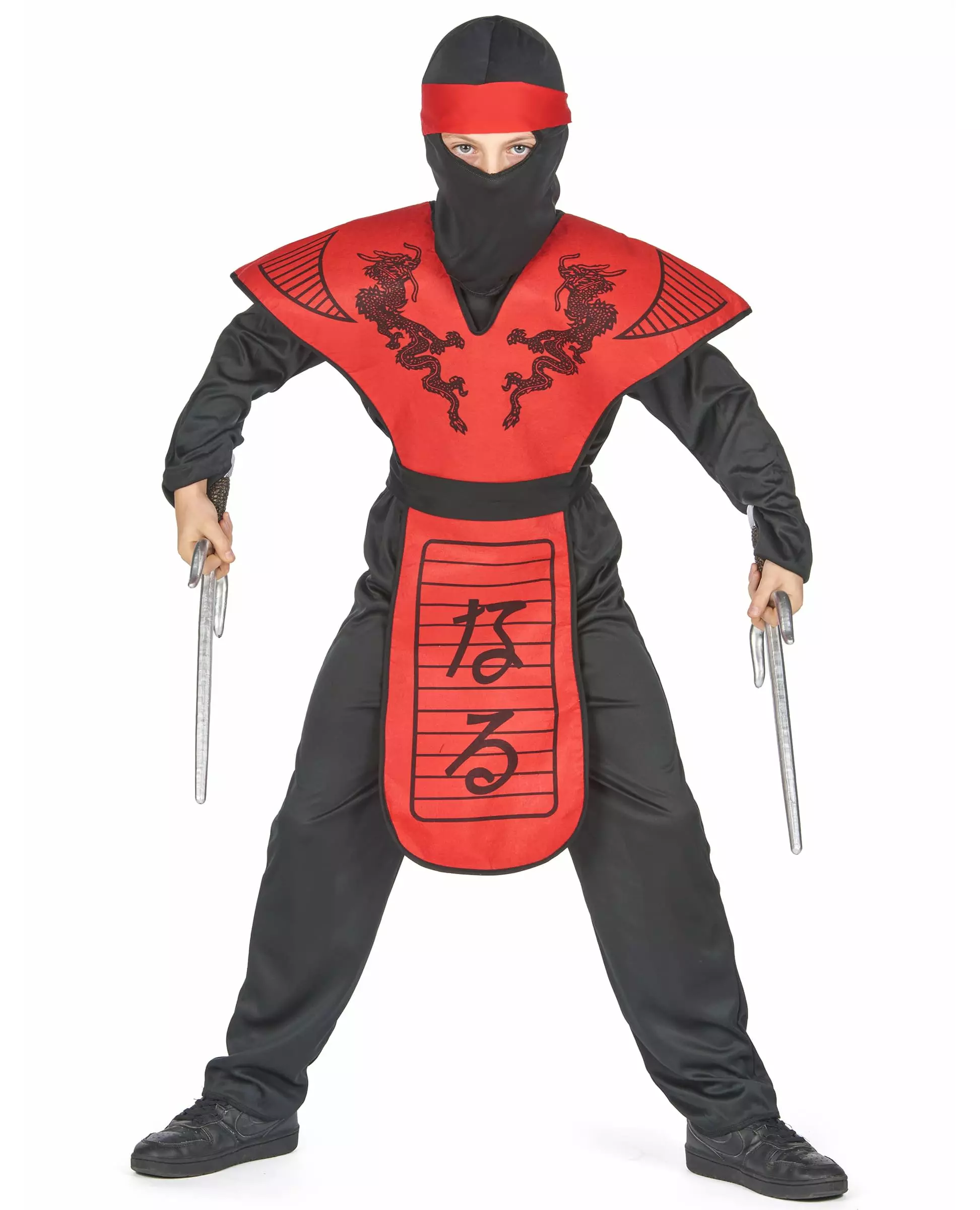 Bli en ekte ninjakriger! Dette røde ninjakostymet for barn består av en topp, bukser, en brystbeskytter, et belte, en hette og et pannebånd. Den langermede toppen og buksene er svarte. Toppen lukkes øverst bak med borrelås, og buksene har en elastisk midje. Den lange brystbeskytteren er rød. Laget av filtstoff, er den dekorert med svarte dragemønstre og faller over forsiden av brystet. Et svart belte hjelper deg med å markere midjen og holde brystbeskytteren på plass. Den lukkes bak med en bred borrelås. En svart hette lar deg gå inkognito. Den har en åpning foran for øynene. Et rødt pannebånd vil sette prikken over i-en på antrekket. Dette kostymet vil være perfekt for å forvandle seg til en ekte ninja til en asiatisk-temafest eller til karneval. Inkludert tilbehør: Topp Bukser Brystplate Hette Pannebånd Belte Materiale: 100 % polyester Vedlikehold: Håndvask