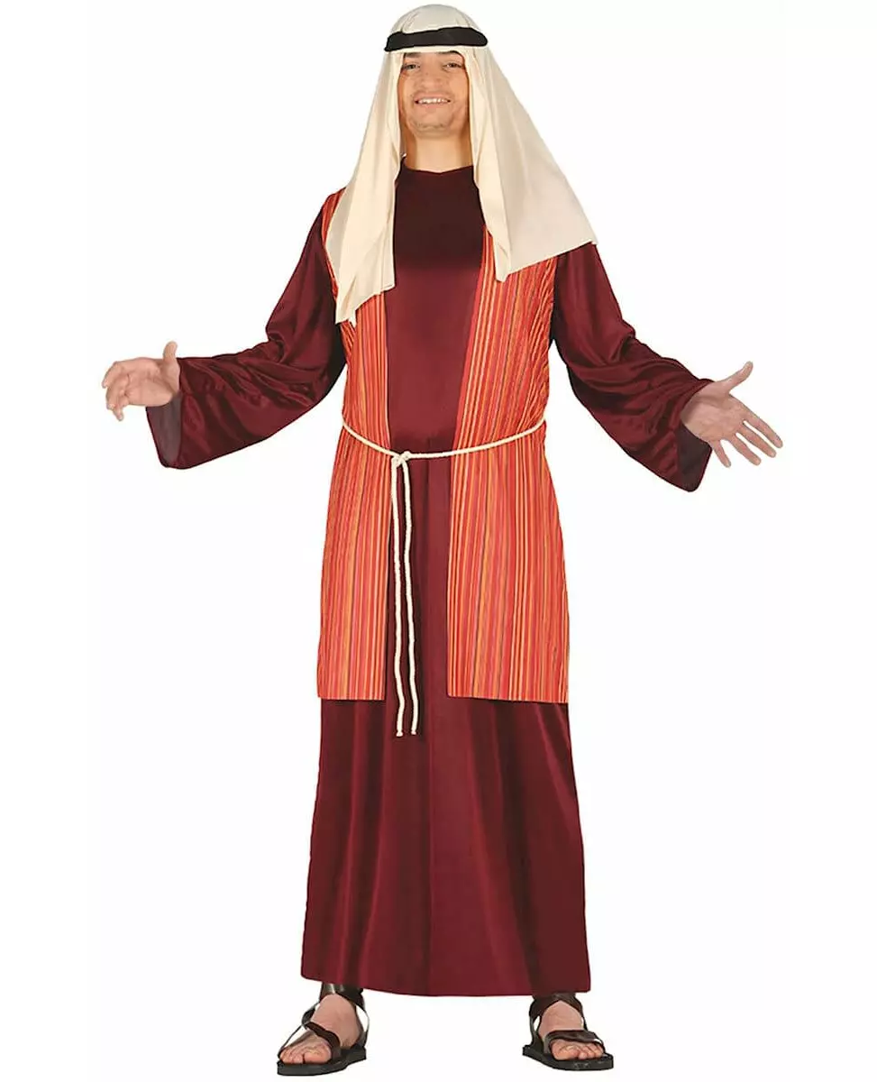 En perfekt gjeter til julekrybbespillet. Dette gjeterkostymet inkluderer et hodeplagg, en tunika og et belte (sko ikke inkludert). Hodeplagget er av langt hvitt stoff med en svart omriss på hodet. Den lange, langermede tunikaen er burgunderrød med en imitert oransje vest sydd på. Beltet består av en hvit snor som knytes rundt livet. Dette røde gjeterkostymet for menn vil være ideelt for å leke en krybbespillgjeter på julaften. Inkludert tilbehør: Hodeplagg Tunika Belte Materiale: 100 % polyester Vedlikehold: Håndvask