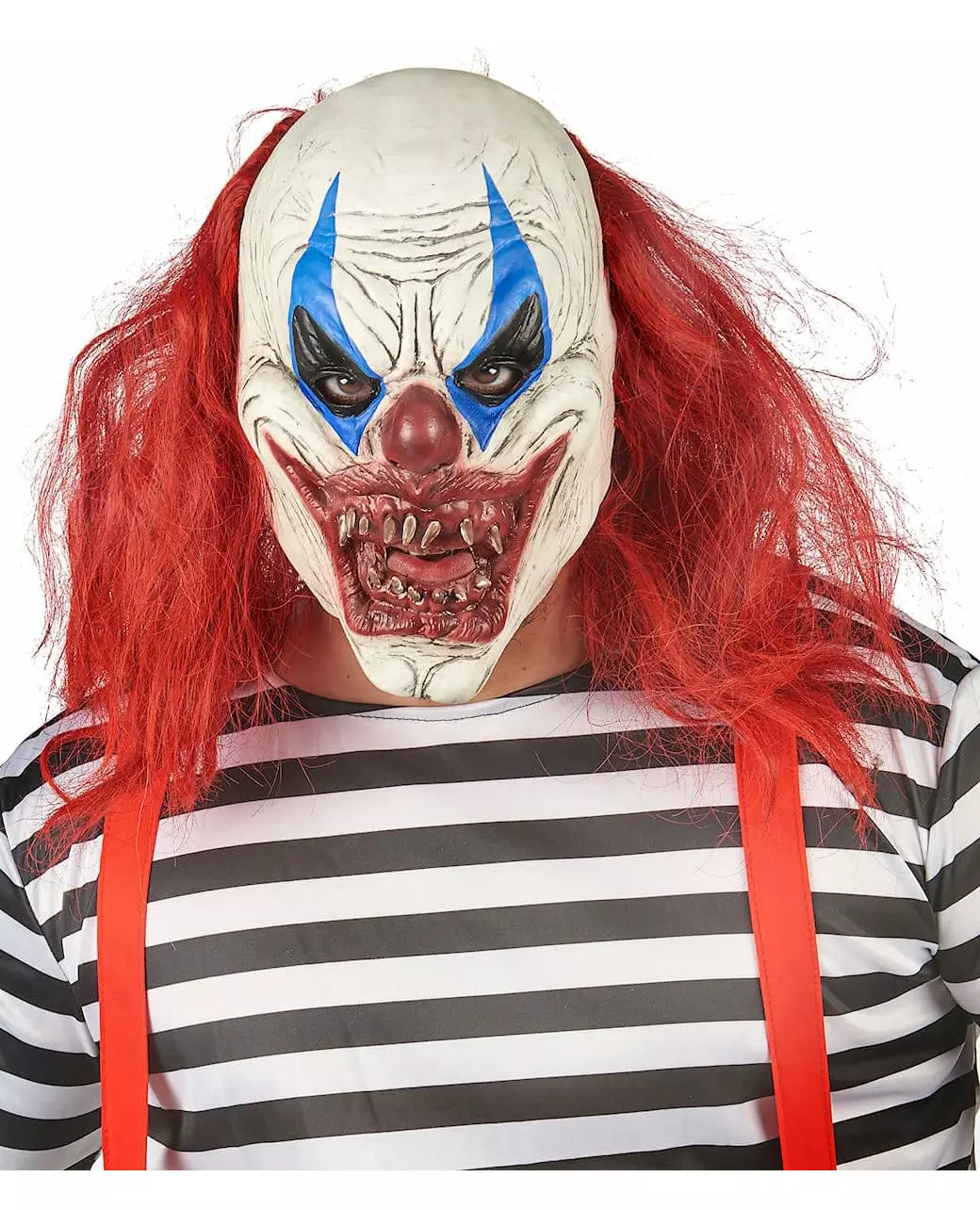 En ikke fullt så morsom klovn ... Denne klovnemasken i lateks er for voksne. Masken er blekhvit, med en forferdelig og blodig munn, tennene er ikke rette. Klovnen har et machiavellisk og skremmende smil, en blodrød nese og to øyne sminket i svart og blått, og et hevet øyenbryn gir den et lurt blikk. På baksiden av masken finner du langt og rett rødt hår. Denne klovnemasken vil være perfekt for Halloween-kvelden eller for en kveld med skrekktema! Inkludert tilbehør: Maskemateriale: Lateks