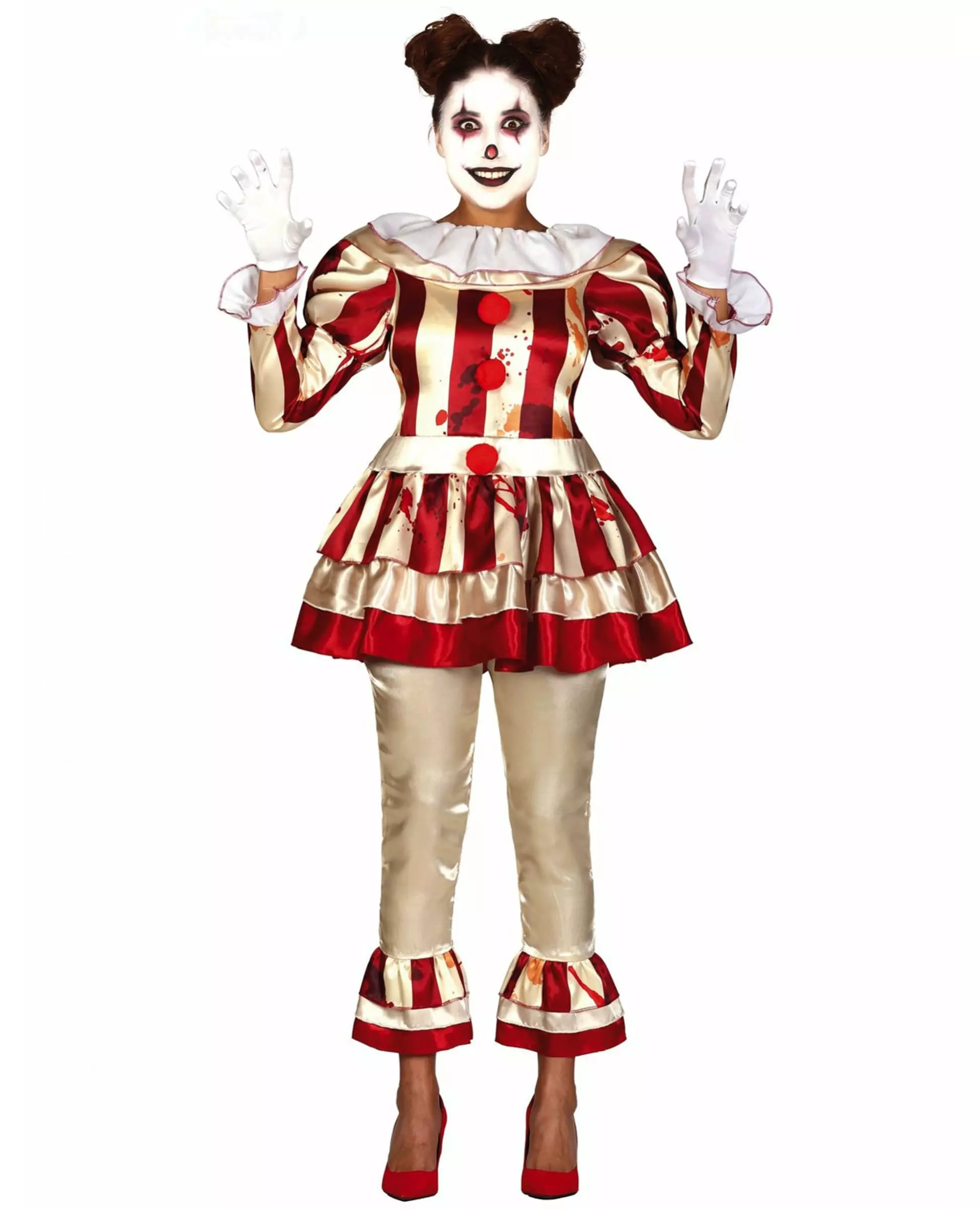 Et skremmende klovnekostyme til Halloween! Dette skremmende klovnekostymet for kvinner består av en skjorte og bukser (sminke, hansker og sko er ikke inkludert). De gullfargede buksene har rysjer langs kantene med røde og off-white striper. Den utsvingte skjorten har også røde og off-white striper. Den er dekorert med røde pomponger, falske blodflekker og en hvit krage. Dette onde klovnekostymet er perfekt for å feire en skremmende Halloween!. Inkludert tilbehør: Topp Bukser Materiale: 100 % polyester Pleie: Håndvask