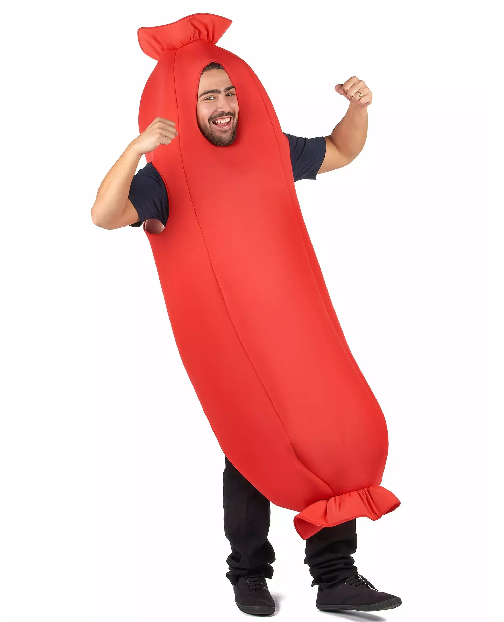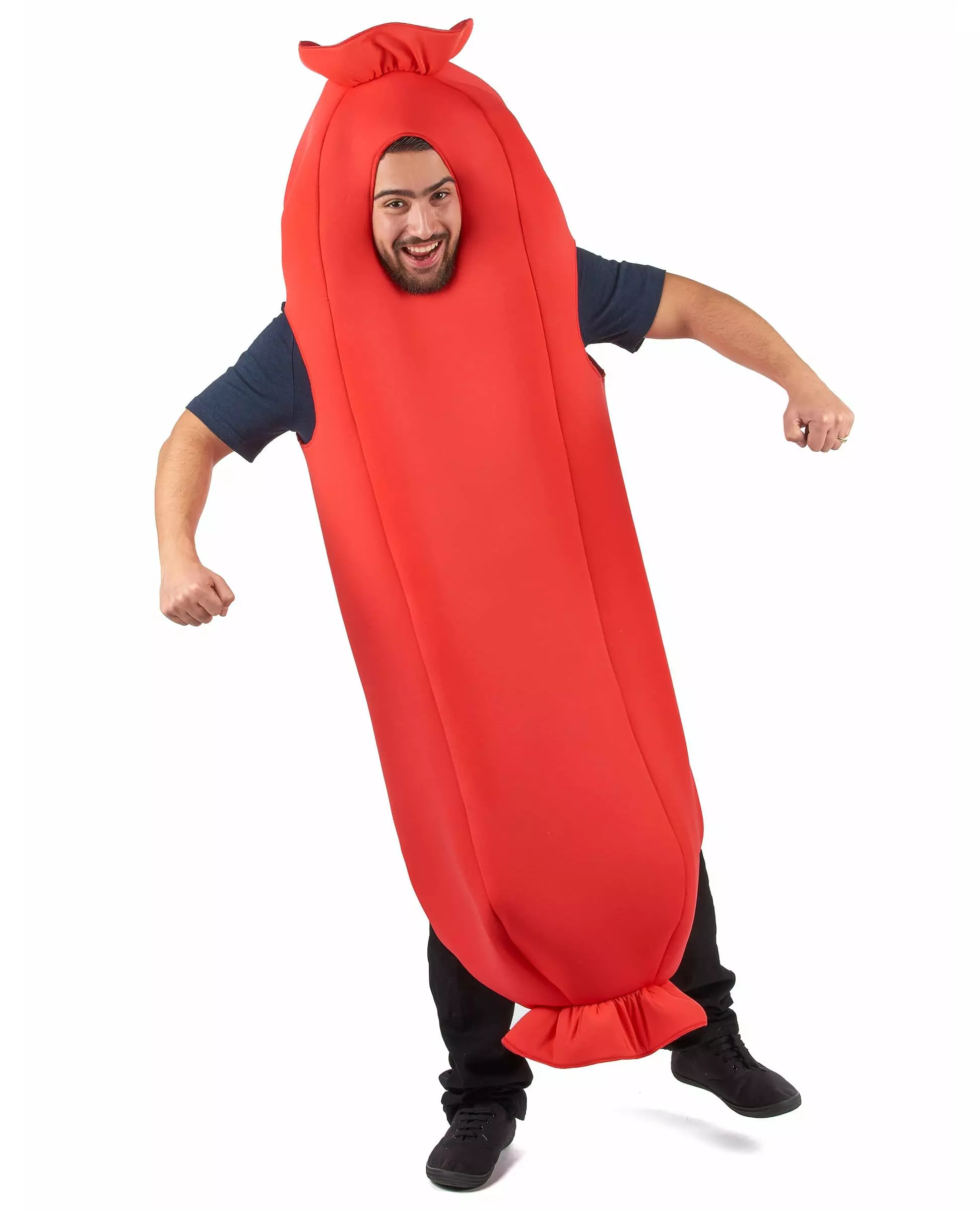 Klar til å kose seg! Dette pølsekostymet for voksne består av en jumpsuit. Jumpsuiten er formet som en pølse. Den er rød med fire åpninger: én til hodet, én til hver arm og én til beina. Den er laget av mykt skum for å få en vakker sylindrisk form og for å lette bevegelsene dine. Dette pølsekostymet vil være perfekt for en kostymefest med komedietema eller for å få vennene dine til å le under et måltid, for eksempel! Inkludert tilbehør: Jumpsuit Materiale: Polyester Stell: Håndvask