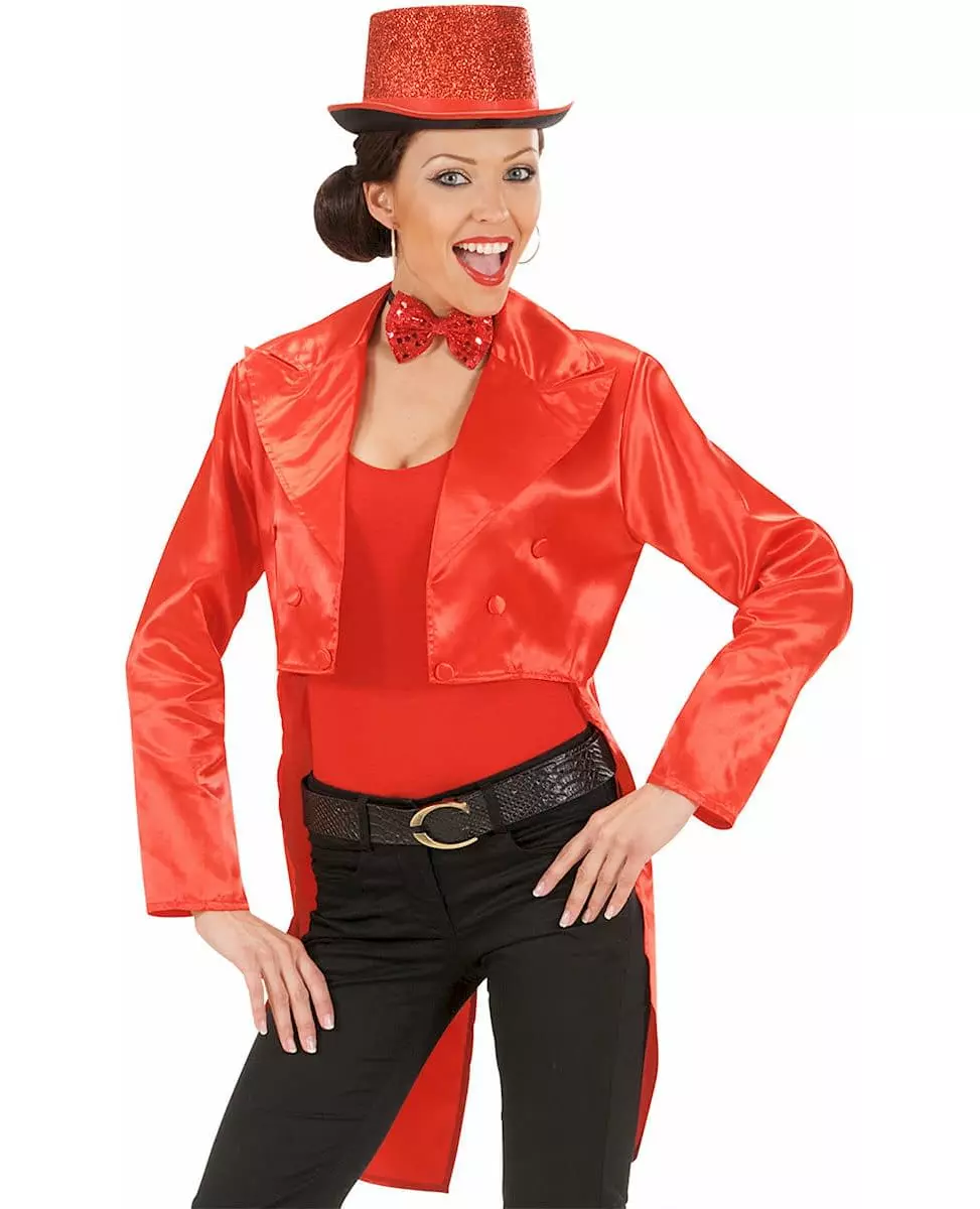 Få hodene deres til å snurre! Denne frakkjakken er for kvinner (jumpsuit, hatt, stokk, strømper og sløyfe er ikke inkludert). Den er designet helt i rød og skinnende sateng. Denne jakken kan brukes under et show eller under karnevalsfesten. Inkludert tilbehør: 1 frakk Materiale: 100 % polyester Vedlikehold: Håndvaskbar