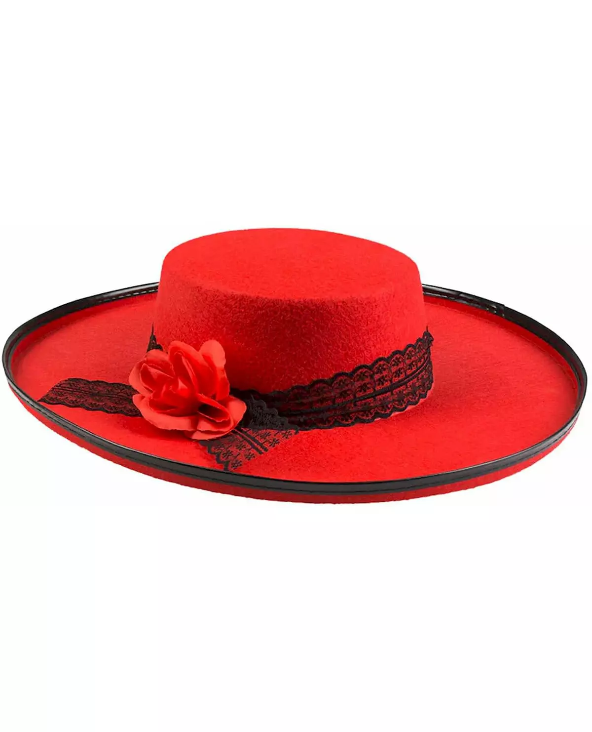 Olé! Denne spanske danserhatten i rød filt er dekorert med et svart blondebånd og en rød blomst. Den vil være perfekt for å sette deg inn i rollen som en flamencodanser! Materiale: Filt Polyester Polyester Stell: Håndvask Mål: 36 cm i diameter