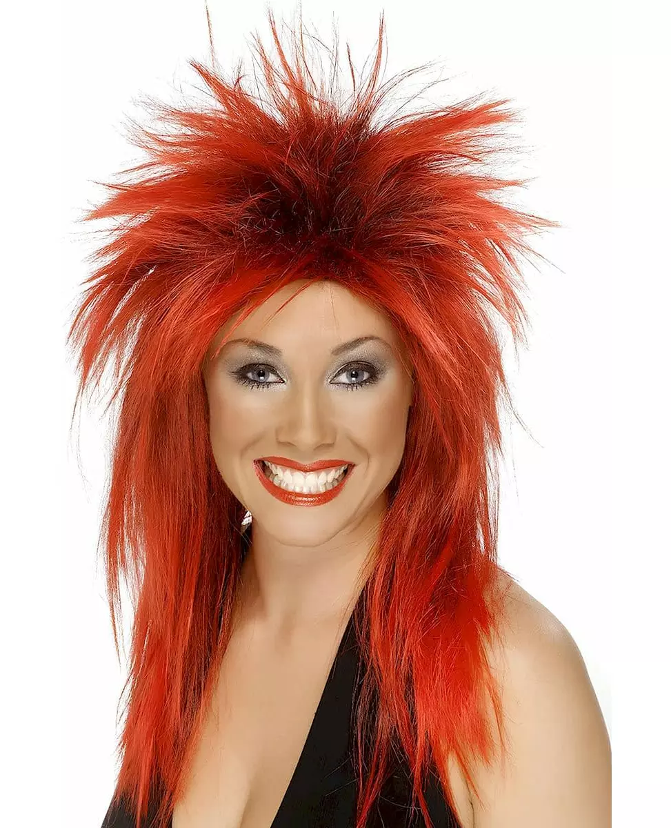 Rock n' roll! Denne mørkerøde diva-parykken for kvinner har rett hår og en "rotete" effekt på toppen. Super parykk, perfekt skreddersydd og utmerket tilbehør til det komplette punk-kostymet på temafester. Inkludert tilbehør: Parykkmateriale: Syntetisk 100 % polyetylen 100 % polyetylen