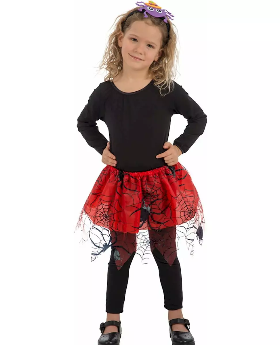 Søtt! Dette tilbehøret er en edderkopp-tutu for jenter (selges separat). Den røde tutuen er elastisk i livet og måler omtrent 30 cm i lengden. Et lengre slør, dekorert med mengder av spindelvev og deres araneider, dekker den. Denne pene edderkopp-tutuen er en enkel måte å skjule datteren din på til Halloween-festen!. Inkludert tilbehør: Tutu Materiale: 100 % polyester Stell: Håndvask Mål: Lengde 30 cm