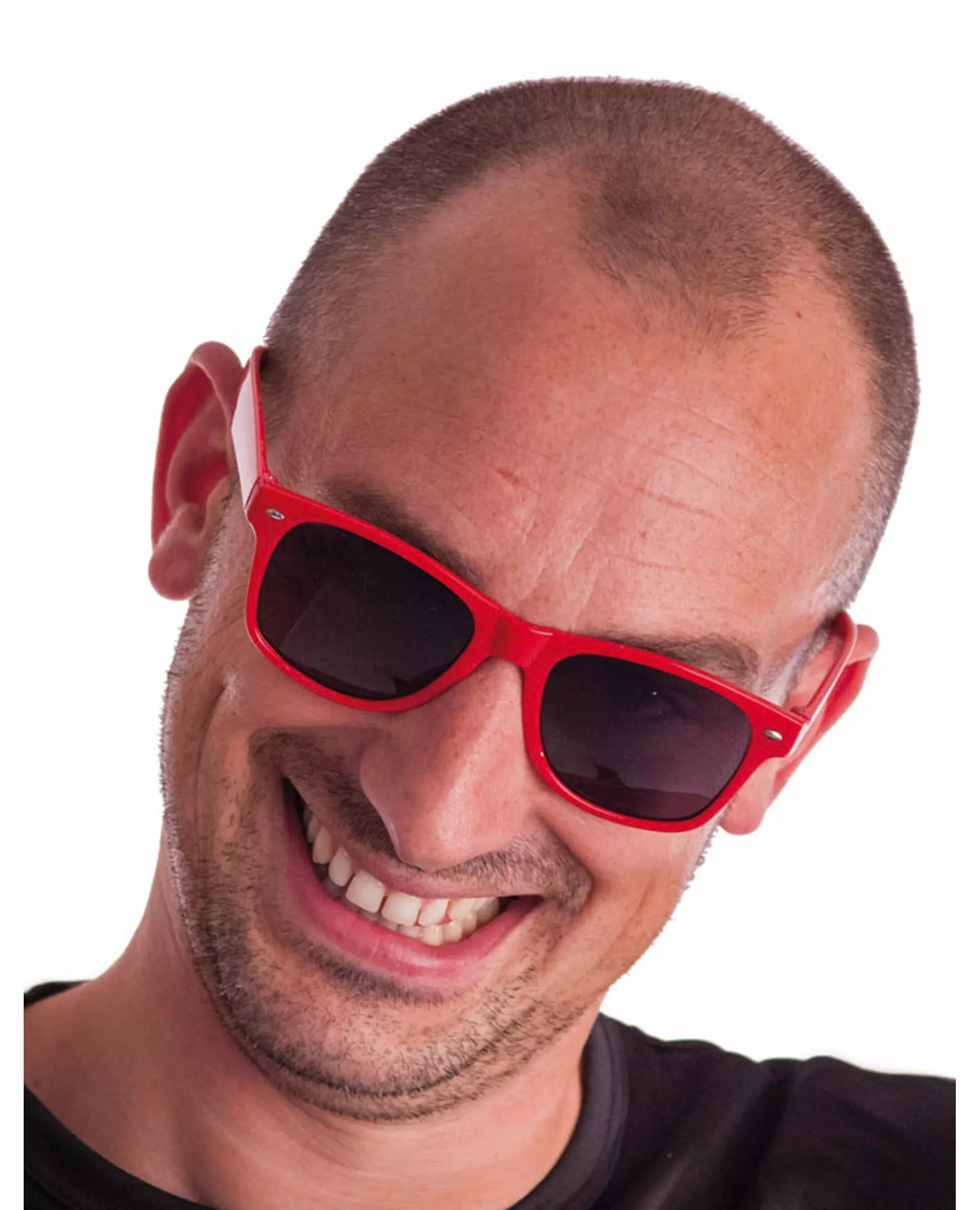 Få et retro-utseende! Disse brillene er for voksne. Glassene har kategori 3-filter og oppfyller EØS-standarder. Innfatningen er laget av plast og er rød. Disse solbrillene vil være det ideelle tilbehøret som komplement til et retrokostyme under utkledningsfestene dine. Inkludert tilbehør: Briller