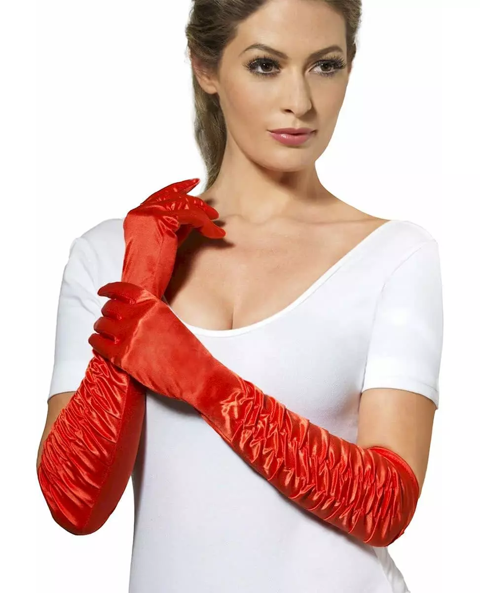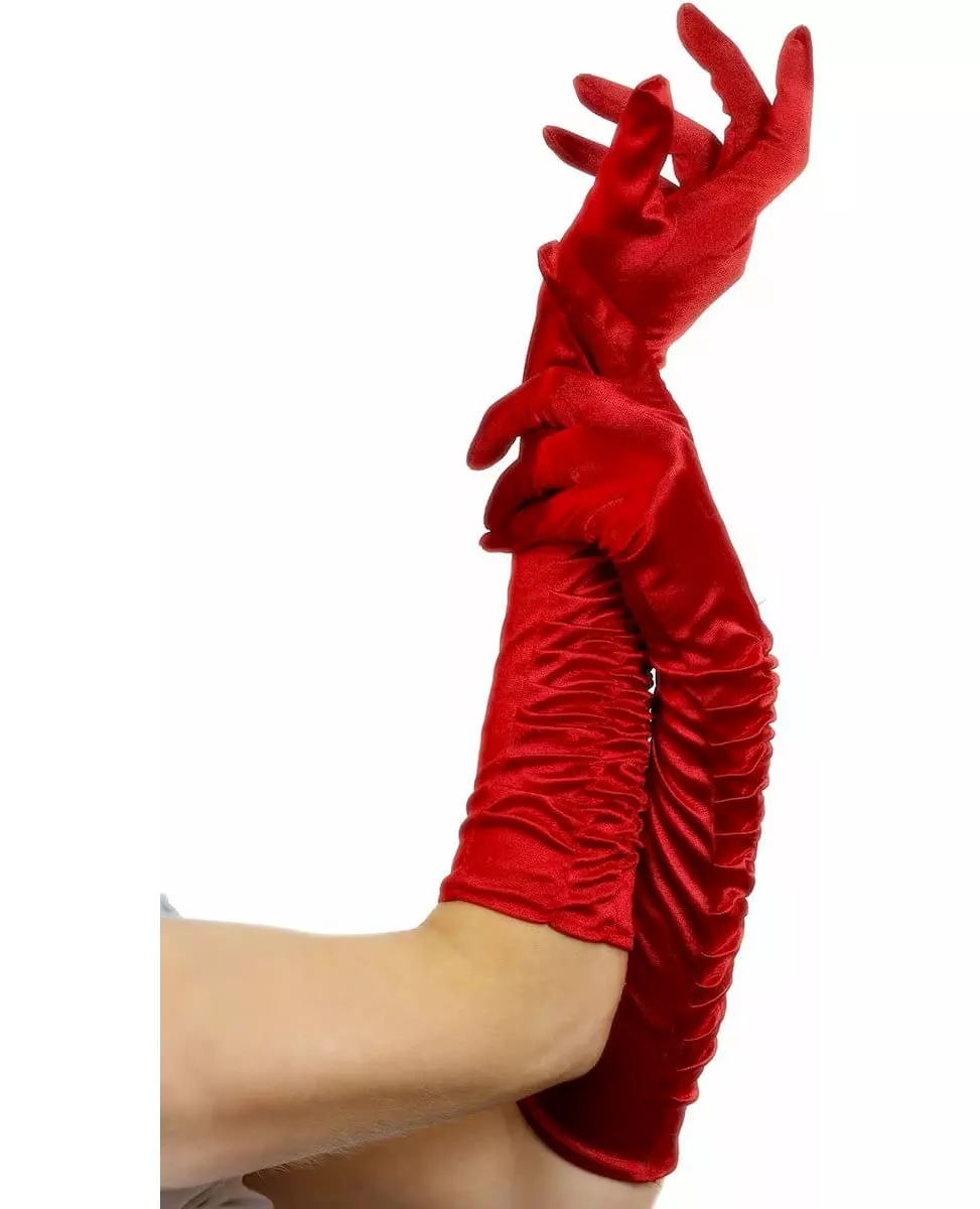 Silkeaktig glamorøs effekt! Disse lange hanskene er laget av rødt satengstoff for å imitere silke og går ned til albuene. De er sydd for å gi svært realistiske plisserte effekter. Disse hanskene er perfekte til å følge glamorøse og sexy damekostymer. Inkludert tilbehør: 1 par hansker Materiale: Polyester Pleie: Håndvask