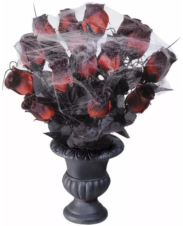En makaber bukett til Halloween Denne dekorasjonen har en plastvase fylt med røde stoffroser. Rosene er dekket av falske spindelvev for en skummel effekt. Denne buketten måler omtrent 35 cm i høyden. Denne dekorasjonen vil være ideell for Halloween-festbordet ditt! © Copyright Widmann SRL. Inkludert tilbehør: Vaser med roser Materiale: Plast, polyester Plast, polyester