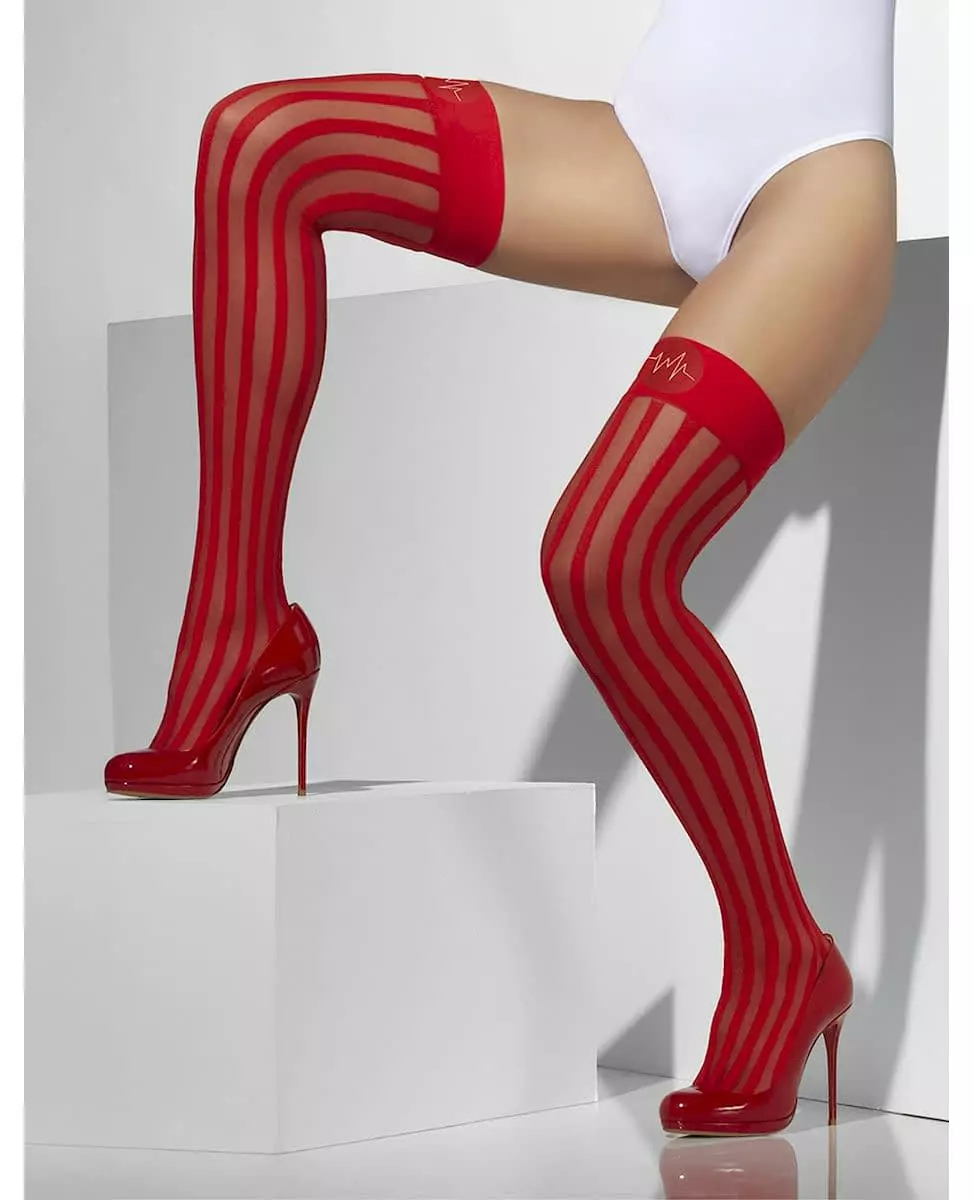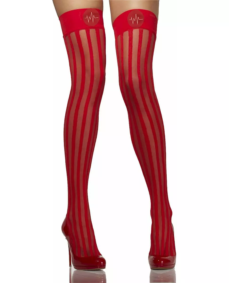 Ta vare på beina dine Disse sykepleierstrømpene for kvinner er røde. De har et hvitt kors øverst på hvert ben. De vil være perfekte for å fullføre sykepleierkostymet ditt på fester med medisinsk tema eller til karneval. Inkludert tilbehør: Par strømper Materiale: 100 % polyester 100 % polyester