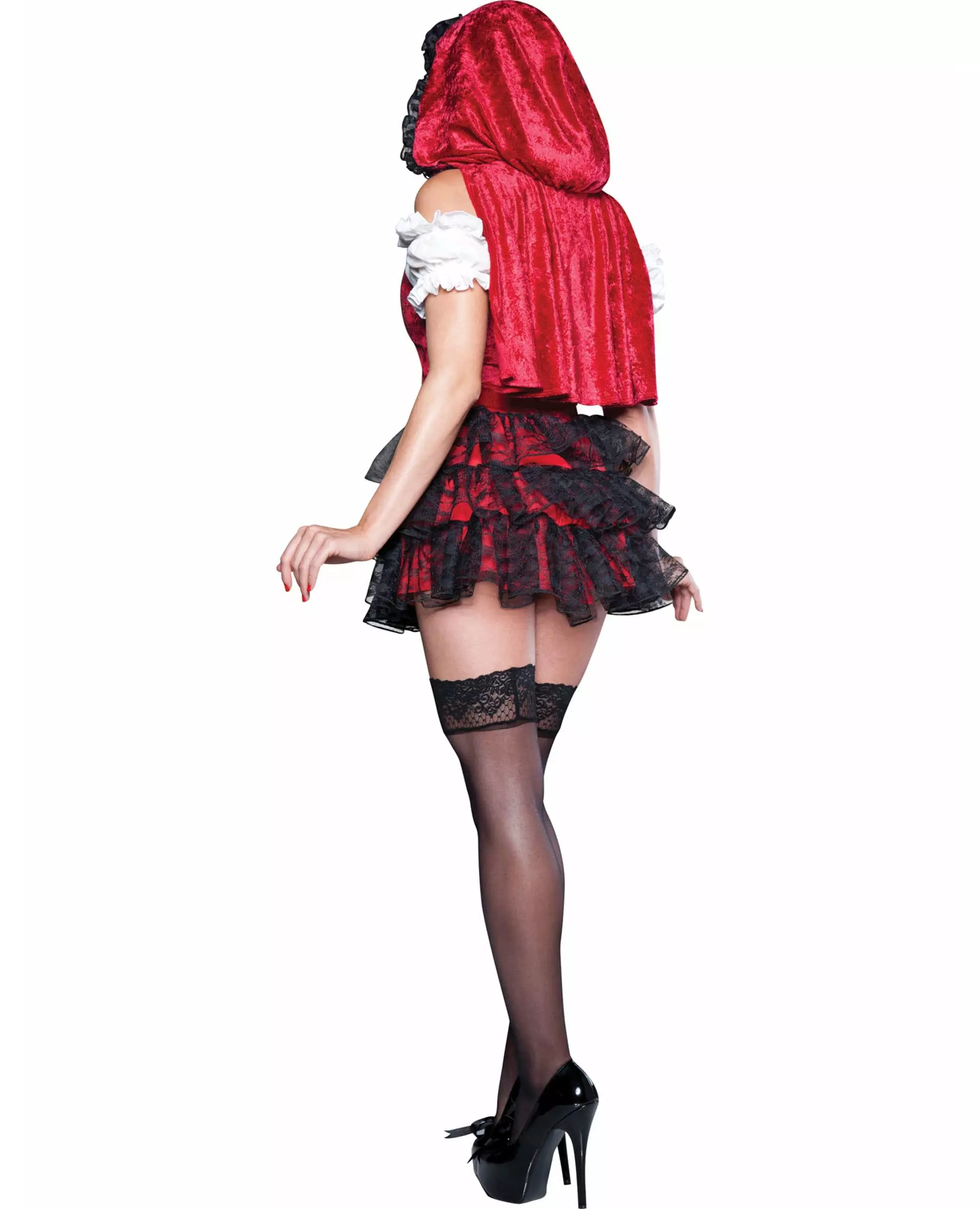 Ulv, er du der?! Dette damekostymet er en kjole. Kjolen er kort og består av et korsett og et skjørt. Det røde korsettet er utsmykket med tykk, svart satengblonder som strammes inn i midjen. Svarte blomster omkranser det og fremhever den dype V-halsen som omslutter en hvit skjorte. Sistnevnte har korte ermer som faller litt og avslører skuldrene for et sexy utseende! Kjolen lukkes bak med glidelås. Skjørtet er rødt og består av tre lag med svart blonde. Du kan legge til et underskjørt for mer volum. Til slutt hviler en rød fløyelshette delikat på hodet. En svart blondekant følger konturene og minner om satengsløyfene som finnes i krysset mellom kappen og kjolen. Sistnevnte, i rød fløyel, faller litt bak og fullfører antrekket. Klar for en tur i skogen i et ertende Rødhette-antrekk? Tilbehør inkludert: 1 kjole Materiale: 100 % polyester Pleie: Håndvask