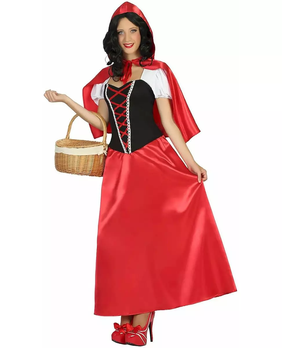 Ta en tur i skogen mens ulven er borte. Dette Rødhette-kostymet for kvinner består av en kjole og en kappe (kurv og sko er ikke inkludert). Den røde kjolen med satengeffekt er lang og har en svart imitasjonskorsetttopp med en rød blonde sydd på. Den er enkel å ta på seg på grunn av elastisiteten. De hvite ermene er laget av fint, mykt stoff. Den røde kappen med satengeffekt er enkel å knyte rundt halsen. Med dette kostymet kan du spille en ekte Rødhette rett ut av en barnefortelling, på kostymefester eller til karneval. Inkludert tilbehør: Dresskappe Materiale: 100 % polyester Vedlikehold: Vask ved 30°
