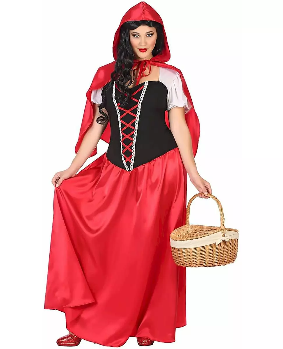 Ta en tur i skogen mens ulven er borte. Dette Rødhette-kostymet for kvinner består av en kjole og en kappe (kurv og sko er ikke inkludert). Den røde kjolen med satengeffekt er lang og har en svart imitasjonskorsetttopp med en rød blonde sydd på. Den er enkel å ta på seg på grunn av elastisiteten. De hvite ermene er laget av fint, mykt stoff. Den røde kappen med satengeffekt er enkel å knyte rundt halsen. Med dette kostymet kan du spille en ekte Rødhette rett ut av en barnefortelling, på kostymefester eller til karneval. Inkludert tilbehør: Dresskappe Materiale: 100 % polyester Vedlikehold: Vask ved 30°