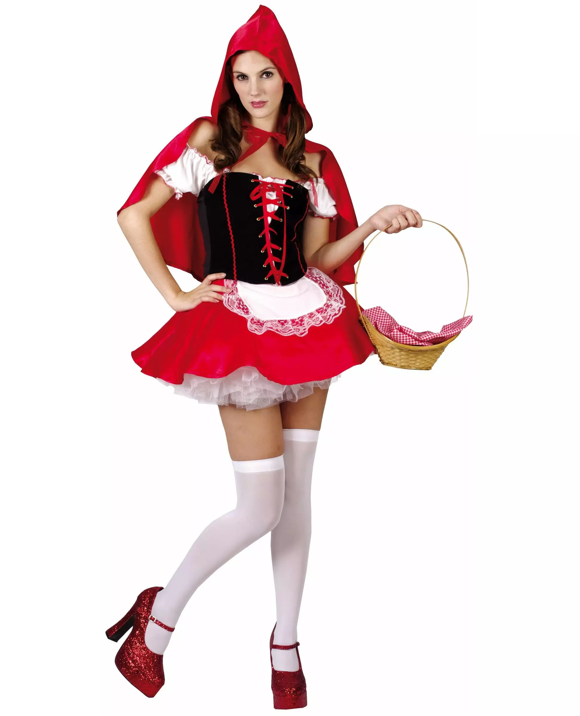 La oss ta en tur i skogen ... Dette Rødhette-kostymet inkluderer en kjole, en kappe og et fint underskjørt. Kjolen har hvite puffermer og et svart korsett ved bysten. Den har også et 33 cm langt rødt skjørt med et lite integrert hvitt forkle. En kappe med hette samt et underskjørt med elastisk midje vil gi antrekket ditt volum. (Strømper, sko og kurv er ikke inkludert). Dette kostymet er perfekt for å leke Rødhette på karnevalsdagen eller til en utkledningsfest. Inkludert tilbehør: Dresskappe Materiale: 100 % polyester Pleie: Håndvask