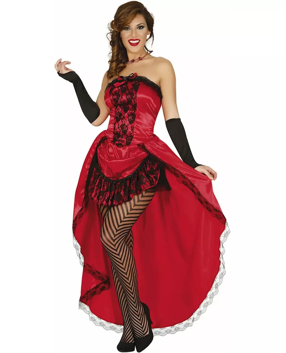 Saloondanser! Dette burleskkostymet er for kvinner, det består av en kjole og mansjetter (halskjede og strømpebukser er ikke inkludert). Den røde kjolen med svart blonde har en bysteformet topp. Den er asymmetrisk, veldig kort foran, og et langt stoffstykke faller ned til føttene bak. Antrekket fullføres av svarte mansjetter som festes til fingrene. Med dette burleskdanserkostymet, enten det er for en kabaret eller westernkveld, vil du være uimotståelig. Inkludert tilbehør: Kjole Mansjetter Materiale: 100 % polyester Pleie: Håndvask