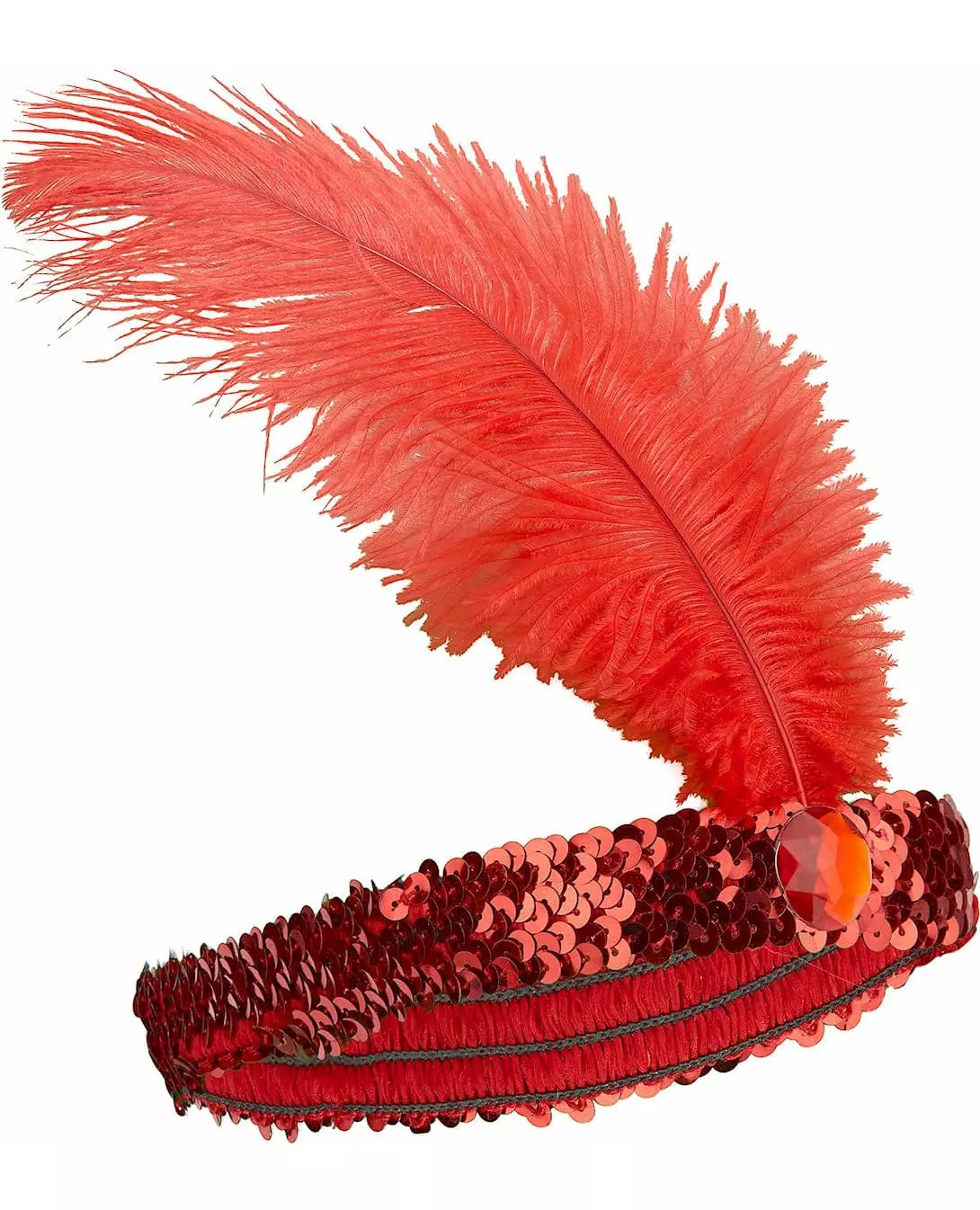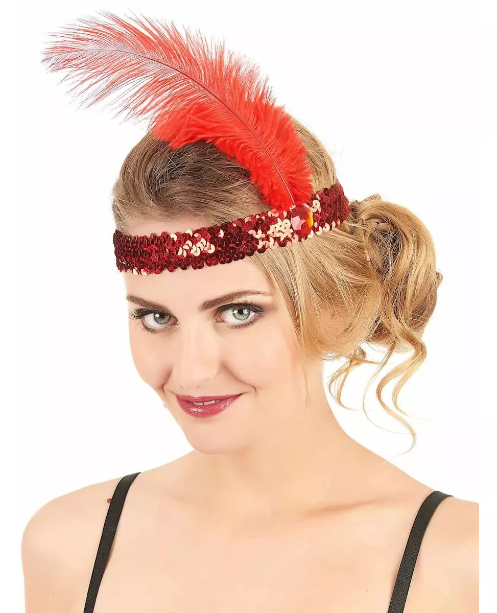 Pulp Red Dette elastiske Charleston-pannebåndet er rødt dekket med skinnende paljetter. En rød edelsten og en fjær i samme farge er limt til pannebåndet. Enten det er til karneval, et show eller en temafest, kan dette pannebåndet utfylle antrekket ditt på en svært estetisk måte. Inkludert tilbehør: Pannebånd