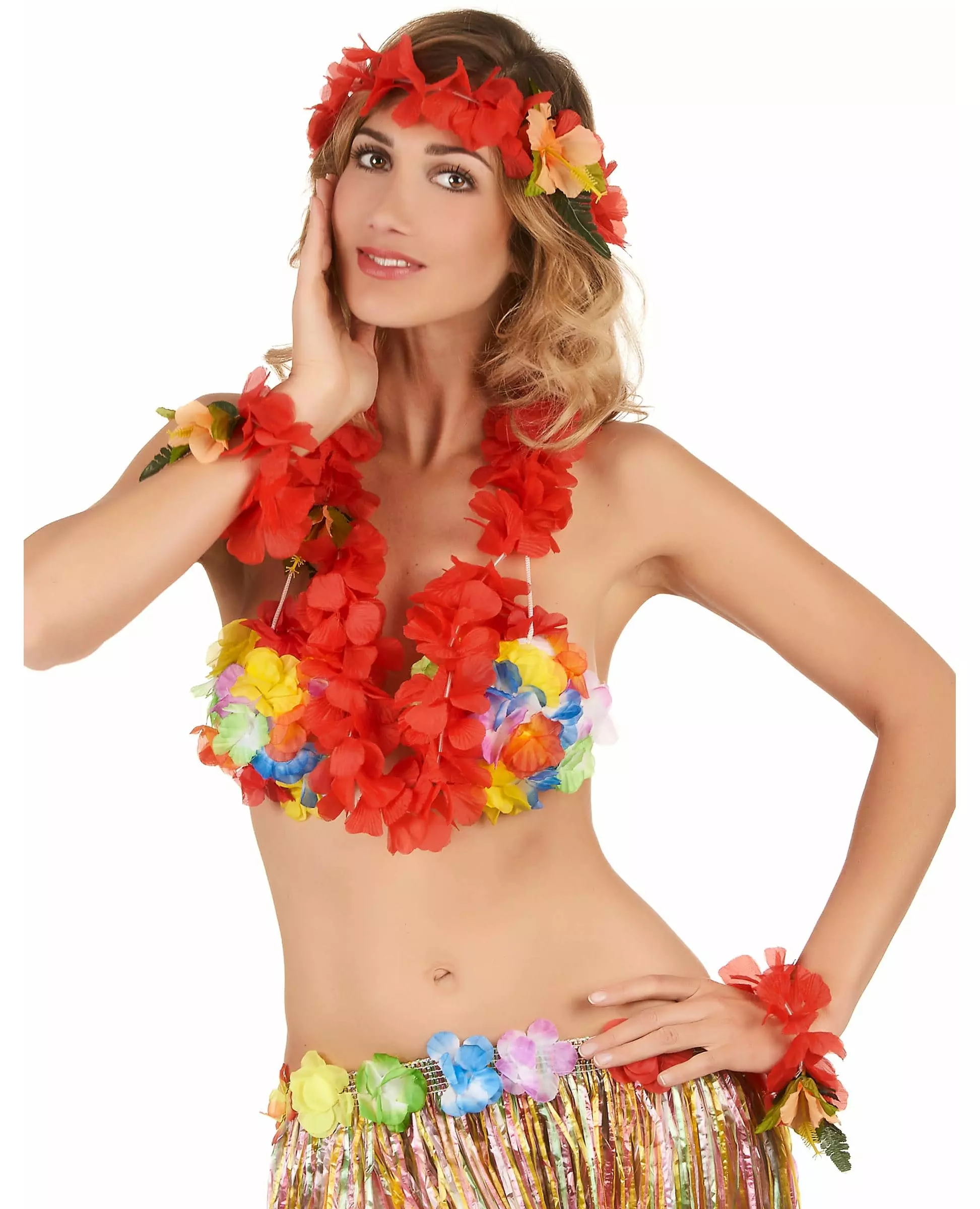 Lidenskapelig rødt! Dette røde hawaiiske settet inkluderer et halskjede, to armbånd og en krone. Alle blomstene er laget av stoff som er koblet sammen av små plastrør. Dette komplette settet vil være ideelt for ditt hawaiiske kostyme til en strandfest eller til og med et danseshow! Inkludert tilbehør: Halskjede 2 armbånd Krone Materiale: Stoff og plast