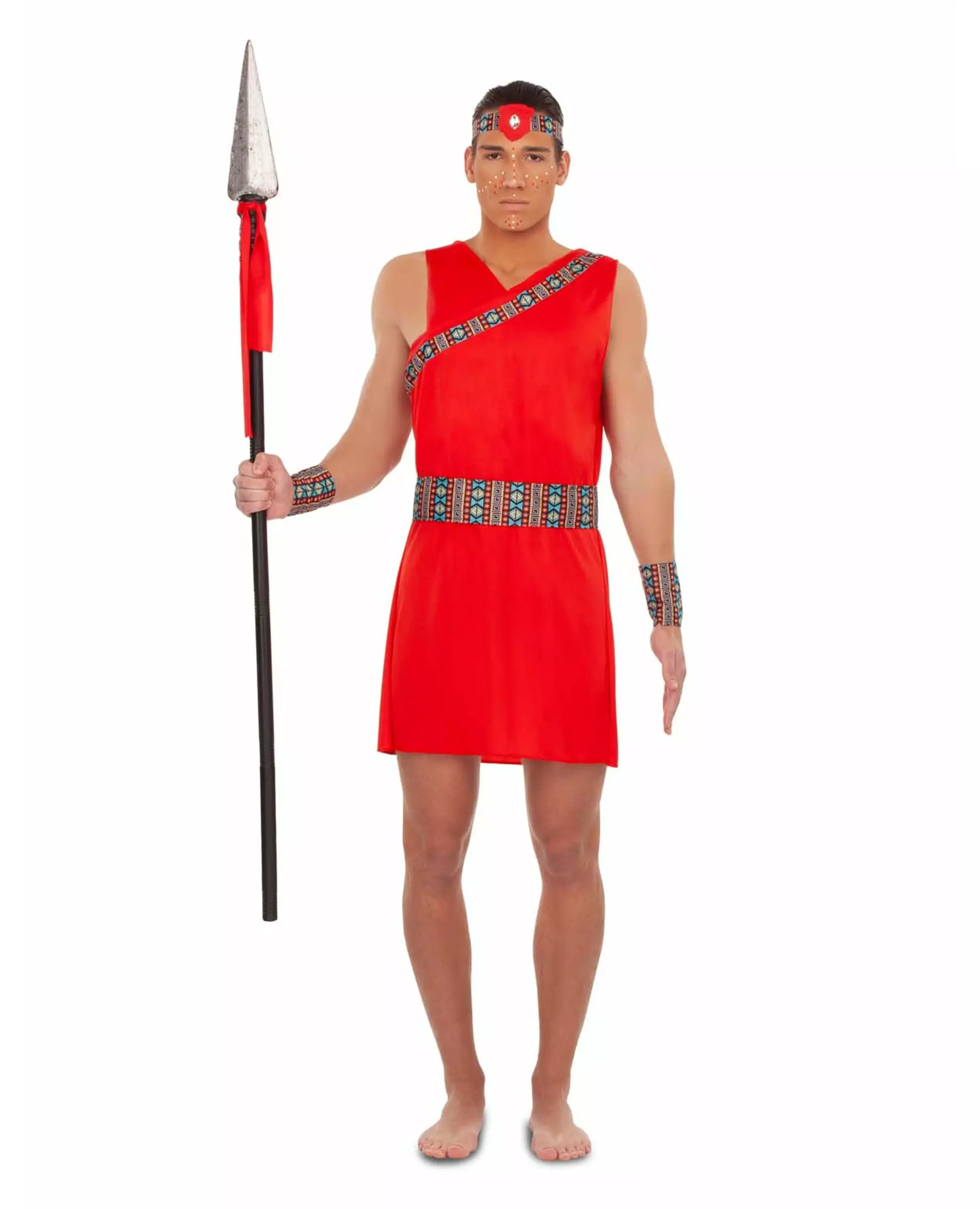 Rødt Maasai-kostyme for menn En mann i tradisjonen Dette røde Maasai-kostymet er for menn og inkluderer et pannebånd, en kjole, et belte og 2 mansjetter (spyd ikke inkludert). Pannebåndet er laget av etnisk mønstret stoff med en rød innsats i pannen. Voksenkostymet inkluderer: Kjole, 2 mansjetter, belte, pannebånd.