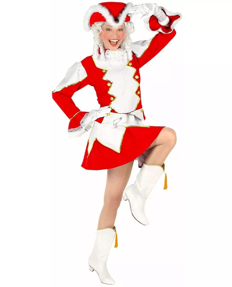 Gjør deg klar til parade! Dette røde majorette-kostymet for kvinner består av en jakke, et skjørt og en hatt (hansker og sko er ikke inkludert). Den rød-hvite jakken er dekorert med gullpaljettkant. Nederst på de utsvingte ermene er det foret med hvit blonder. Gullknapper dekorerer også forsiden av jakken. Denne jakken lukkes foran med glidelås. Det matchende skjørtet er rødt og hvitt. Det er dekorert med gullpaljettkant. Det har en elastisk midje for ekstra komfort. Den røde trefargede hatten er dekorert med hvite fjær. Dette kostymet vil være perfekt for å spille en ekte majorette på karnevalet. «Copyright Widmann SRL».. Inkludert tilbehør: Jakke Skjørt Hatt Materiale: 100 % polyester Vedlikehold: Håndvask