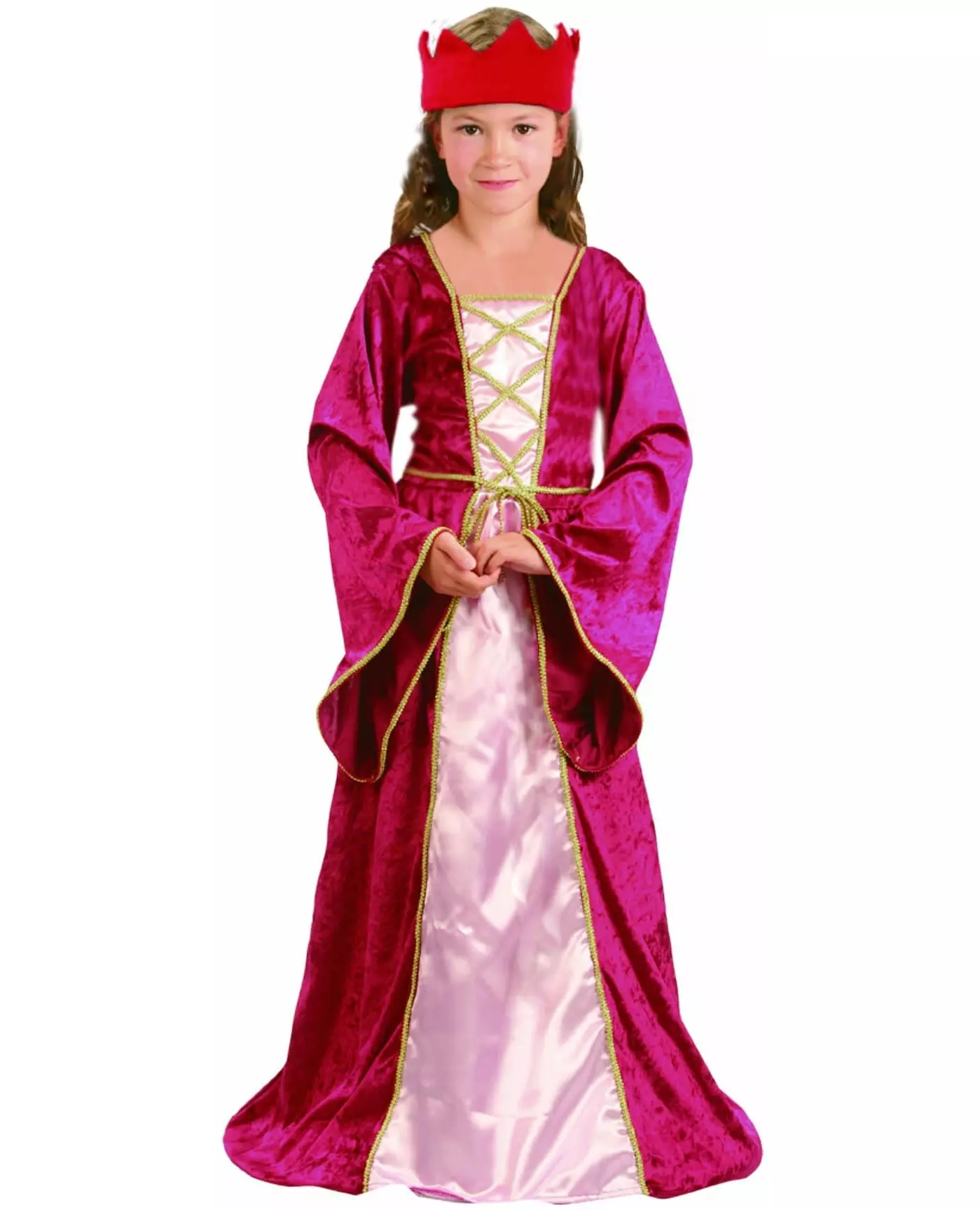 Hodeplagg inkludert! Dette middelalderdronningkostymet består av en kjole og et hodeplagg. Kjolen er lang og kan bæres over hodet uten spesiell lukking. Stoffet er bringebærfarget og fløyel, bortsett fra foran, hvor kjolen er laget av lyserosa satengstoff. Det er en falsk gullsnøring foran, og midjen er tettsittende. De lange ermene utvides mot hendene. Hodeplagg består av en myk skumkrone dekket av fløyel i samme farge som kjolen. Den kan enkelt festes rundt hodet takket være en strikk. Dette vakre kostymet vil være ideelt for datteren din som skal være dronning på bursdagen sin eller til karnevalet. Tilbehør inkludert: Kjole Hodeplagg Materiale: 100 % polyester Stell: For hånd Målinformasjon: For størrelse 7/9 år: Kjolen måler 109 cm lang, brystmålet er 70 cm, midjemålet er 56 cm og hoftemålet er 80 cm.