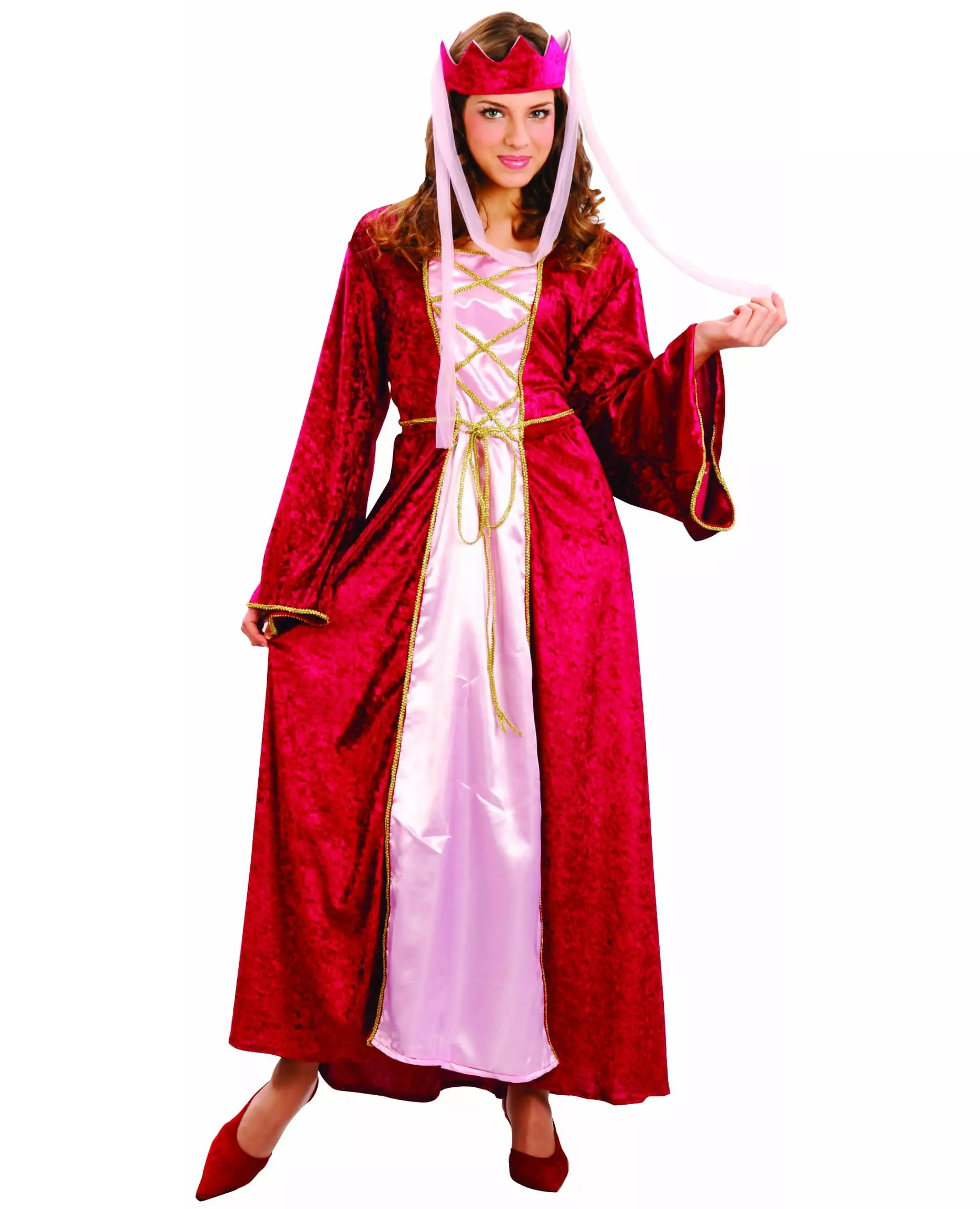 Veldig behagelig materiale! Middelalderdronningkostyme for kvinner, bestående av en lang rød imitert fløyel og lyserosa satengeffekt, kantet med gullkanter og et matchende hodeplagg. Midjen er elastisk for komfort og passer til et stort antall størrelser. Hodeplagget fremkaller en fuchsia krone med fløyelseffekt. Rosa tyllbånd pynter ansiktet fint (Sko ikke inkludert). Dette kostymet er ideelt for middelalderarrangementer, karneval eller andre utkledningsarrangementer. Inkludert tilbehør: Hodeplagg Materiale: 100 % polyester Stell: For hånd