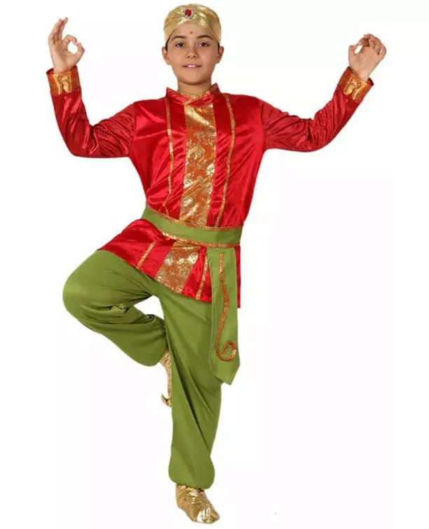 Fordyp deg i Bollywood-stemningen! Dette indiske guttekostymet består av en tunika, bukser, hodeplagg og et belte. Den lange, røde satengtunikaen lukkes med borrelås bak. Oransje stoffbånd med gullfargede blomstermønstre er plassert nederst på ermene, midt på tunikaen og rundt kragen. De grønne buksene har en elastisk midje for ekstra komfort. Hodeplagget er laget av skinnende gullfarget stoff med en imitert rød stein foran. En liten elastisk strikk bak gir en sikker passform. Det grønne beltet, som matcher buksene, lukkes bak med borrelås ved hjelp av en ripe. En oransje skråkant er sydd rundt beltet og tegner et abstrakt mønster foran. Dette kostymet vil være perfekt for karneval eller for en kveld med temaet India eller Bollywood. Inkludert tilbehør: Tunika, Bukser, Hodeplagg, Belte. Materiale: 100 % polyester.
