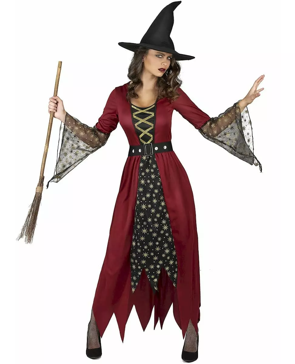 Paljetter og magiske triks! Dette heksekostymet for kvinner inkluderer en kjole, et belte og en hatt. Kjolen, kortere foran, har en vakker mørkerød farge. Ermene og forsiden (fôret med svart stoff) på kjolen er laget av svart tyll med et gullstjernemønster. Beltet er knyttet bak og vil fremheve midjen vakkert. En plastspenne og skinnende falske knapper dekorerer tilbehøret. Til slutt er heksehattens metallramme for støtte laget av skum. Et samlingspunkt gir hodeplagget dette buede utseendet. (Hodeomkrets på ca. 58 cm) Dette elegante settet vil være perfekt for å legemliggjøre en veldig vakker heks på Halloween-kvelden!. Inkludert tilbehør: Kjole Belte Hatt Materiale: 100 % polyester Stell: Håndvask Målinformasjon: Hattens hodeomkrets: ca. 58 cm.