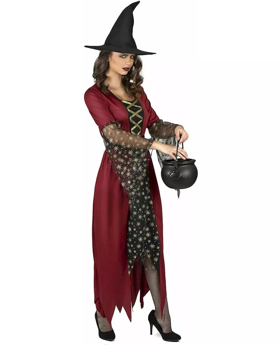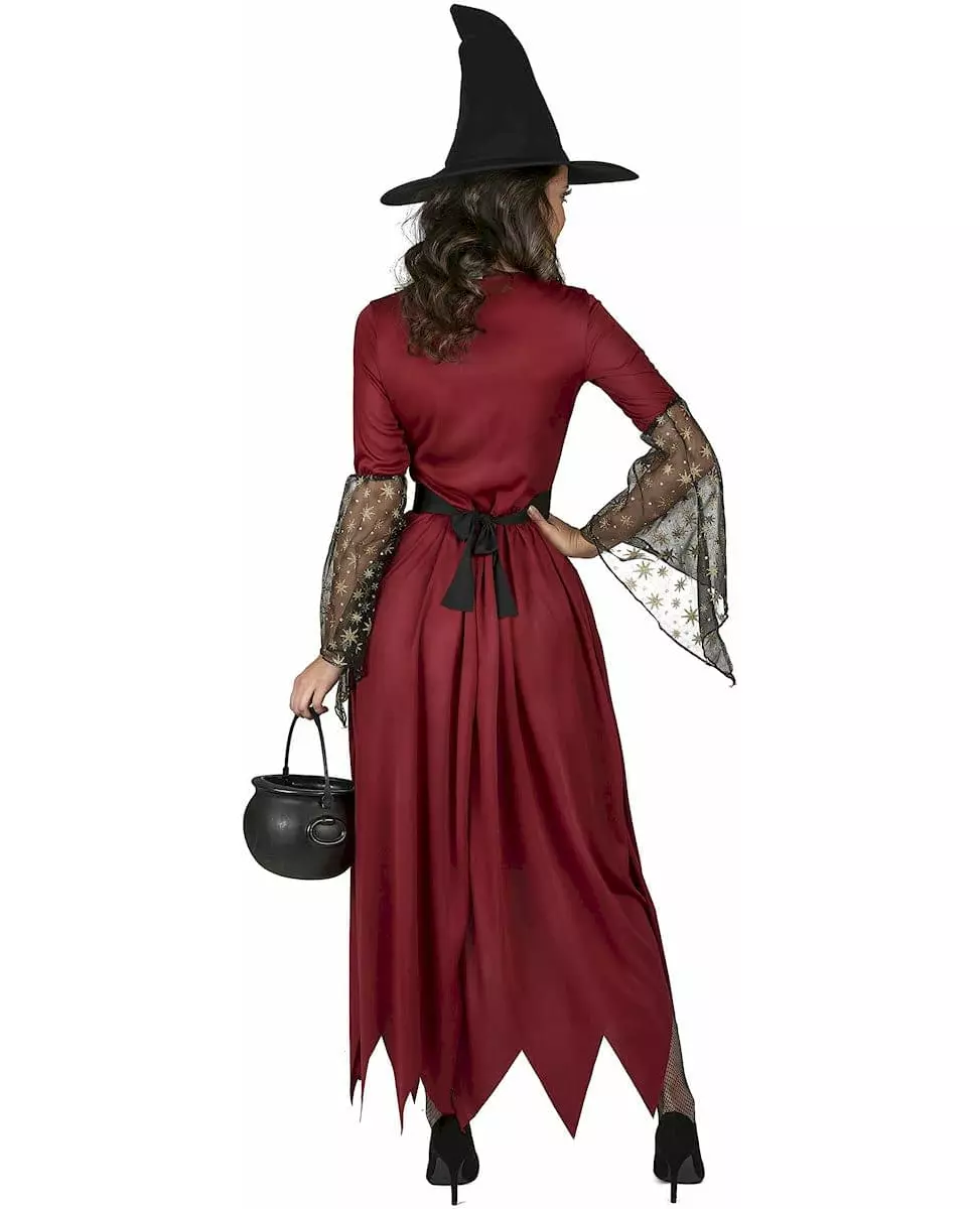 Paljetter og magiske triks! Dette heksekostymet for kvinner inkluderer en kjole, et belte og en hatt. Kjolen, kortere foran, har en vakker mørkerød farge. Ermene og forsiden (fôret med svart stoff) på kjolen er laget av svart tyll med et gullstjernemønster. Beltet er knyttet bak og vil fremheve midjen vakkert. En plastspenne og skinnende falske knapper dekorerer tilbehøret. Til slutt er heksehattens metallramme for støtte laget av skum. Et samlingspunkt gir hodeplagget dette buede utseendet. (Hodeomkrets på ca. 58 cm) Dette elegante settet vil være perfekt for å legemliggjøre en veldig vakker heks på Halloween-kvelden!. Inkludert tilbehør: Kjole Belte Hatt Materiale: 100 % polyester Stell: Håndvask Målinformasjon: Hattens hodeomkrets: ca. 58 cm.