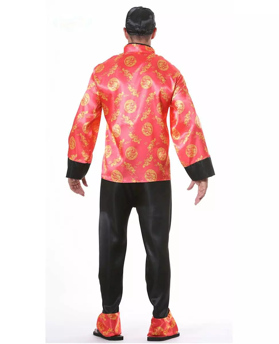 Kle deg ut i en tradisjonell drakt med dette røde og gullfargede kinesiske kostymet for menn! Dette røde og gullfargede kinesiske kostymet er for menn. Det inkluderer hatt, jakke og bukser (bart og sko er ikke inkludert). Hatten er laget av svart stoff. Den har ikke visir, som tradisjonelle hatter. Toppen er laget av rødt satengstoff med gullfargede asiatiske mønstre. Brede, svarte mansjetter lar deg stikke hendene sammen for å skjule dem. Til slutt er de flagrende, rettskårne, løstsittende buksene helt svarte. Dette røde og gullfargede kinesiske kostymet vil være perfekt for et karneval med temaet "Verdensland" eller tradisjonelle kostymer. Inkludert tilbehør: Hatt, jakke, bukser Materiale: 100 % polyester Vedlikehold: Håndvask