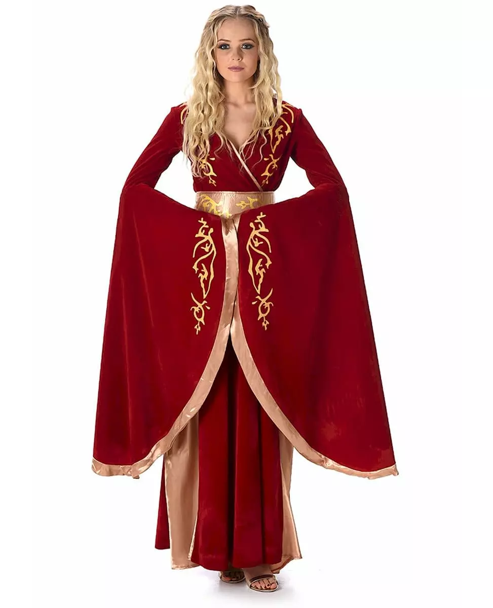 Bli festens dronning! Dette middelalderkostymet for kvinner består av en lang kjole (sko ikke inkludert). Denne lange røde kjolen går ned til anklene. Den har lange, utsvingte ermer inspirert av middelalderen. V-halsen og den tettsittende midjen er dekorert med utsøkt gullkant. Dette middelalderkostymet er perfekt for karneval eller en middelalderfest! Inkludert tilbehør: Kjole Materiale: 100 % polyester Pleie: Håndvask