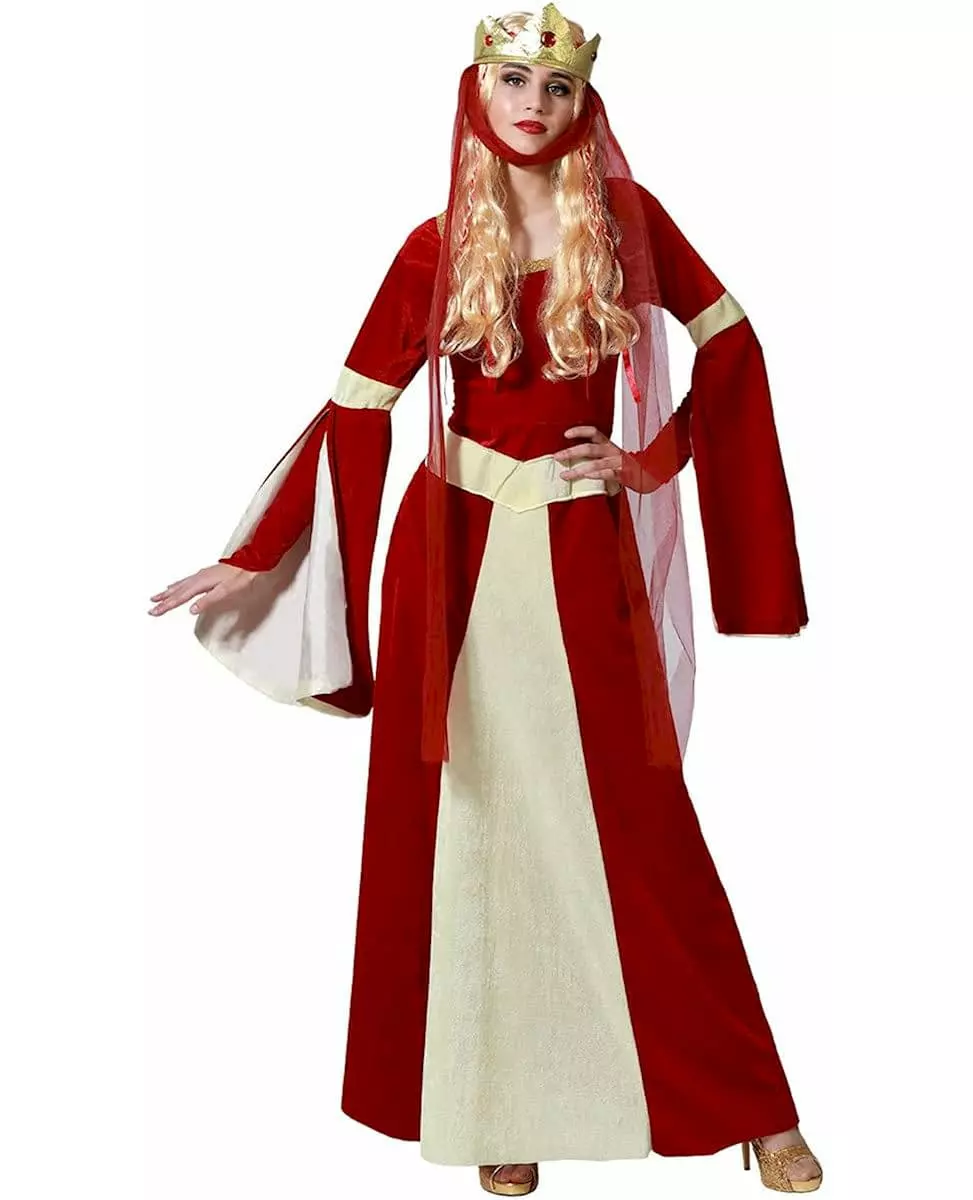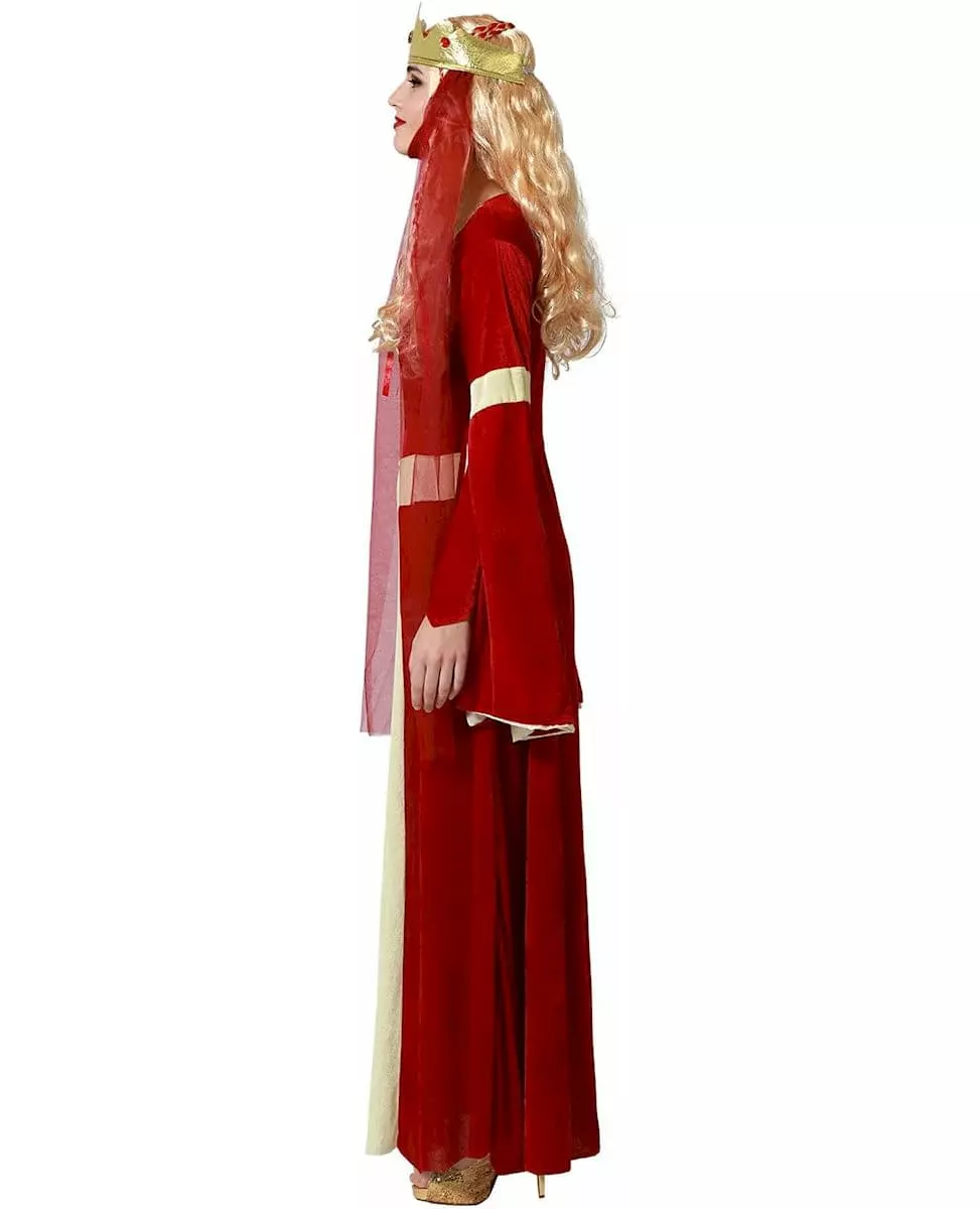 Hør, hør, jomfru! Dette røde og gullfargede middelalderkostymet for kvinner består av en lang kjole og en krone med slør (parykk og sko er ikke inkludert). Kjolen i fløyelseffekt er rød med beige bånd på albuene og foran. Kjolens topp har en firkantet halsutringning dekorert med gulldetaljer. De lange røde ermene er laget av utsvingte overermer med beige plastbelagt stoff på innsiden. Et falskt beige belte er sydd foran i midjen. Den gylne kronen er laget av skum for maksimal komfort. Den holder seg på plass med en strikk. Den er dekorert med 3 falske røde juveler og et langt rødt slør sydd direkte på den. Sløret går under haken og henger på sidene. Dette kostymet vil være ideelt for karneval eller kostymefest! Inkludert tilbehør: Kronekjole med slør Materiale: 100 % polyester Pleie: Håndvask