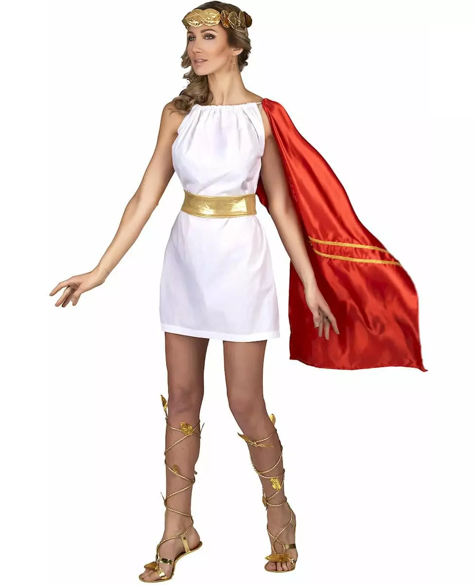 For en klasse! Dette romerske kostymet for kvinner inkluderer en kjole, en stola og et belte (pannebånd og sandaler er ikke inkludert). Kjolen er laget av tykt hvitt stoff. En snor i halsen kan strammes som du ønsker for å skape en rynket effekt. Stolaen kan arrangeres som du ønsker, da den ikke er sydd fast på plagget. Den er satengrød med to gullfletter. Til slutt er det gullfargede beltet elastisk og vil stramme inn livet ditt veldig fint. Perfekt antrekk for å fordype deg i antikken under et kostymearrangement eller til en temafest. I én størrelse, den passer personer opptil størrelse 42. Inkludert tilbehør: Kjolestola Belte Materiale: 100 % polyester Stell: Håndvaskbar