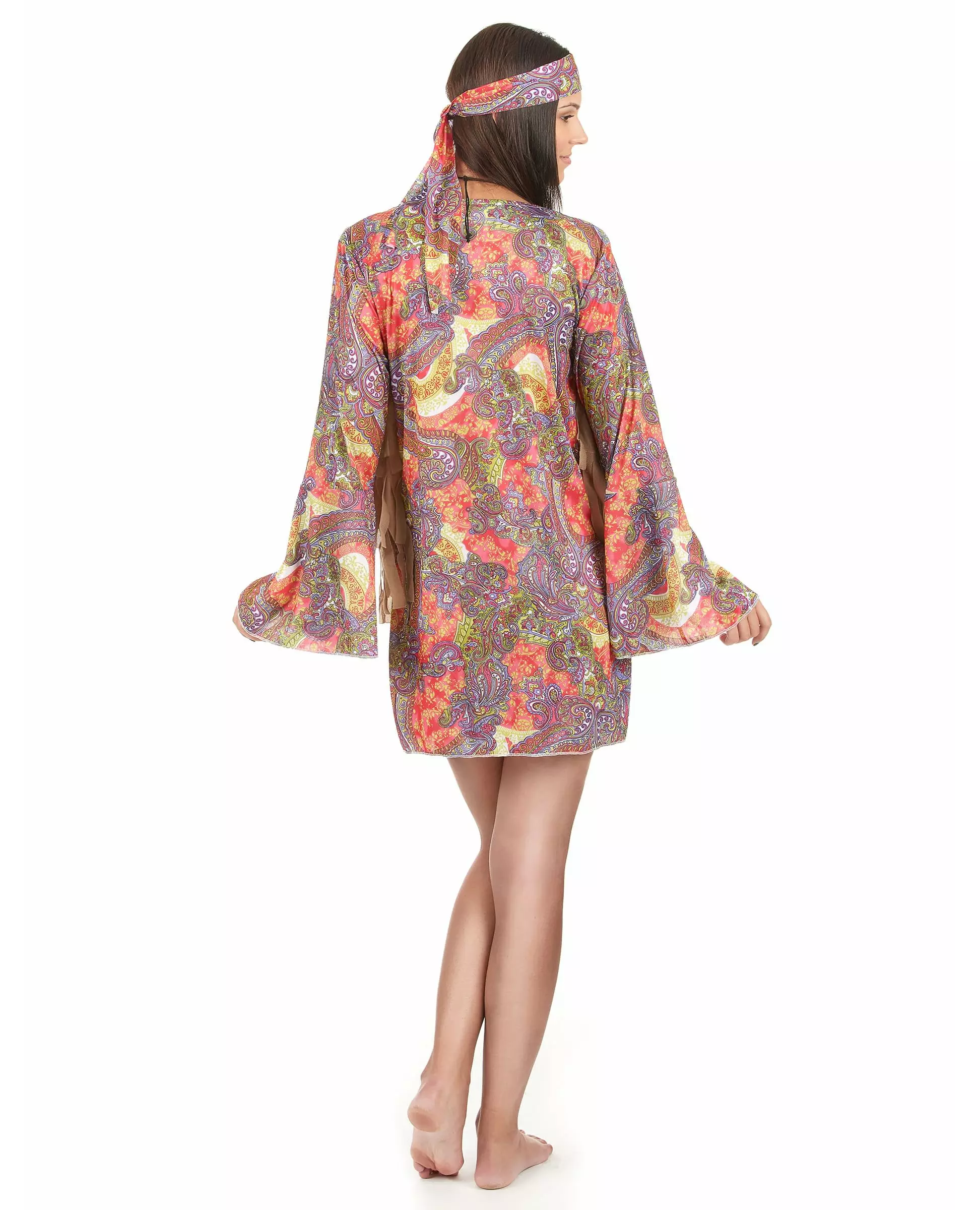 Midt i syttitallet! Dette hippiekostymet for kvinner består av en kjole, en vest, et pannebånd og et halskjede (sko ikke inkludert). Kjolen er kort og fargerik, med lange, utsvingte ermer. Vesten er lysebrun med frynser. Halskjedet er svart med et gult "Peace & Love"-skilt. Et stoffpannebånd identisk med det på kjolen er også inkludert for å knyte det i håret. Dette hippiekostymet for kvinner vil være perfekt til karneval eller andre festlige arrangementer med 70-tallstema. Inkludert tilbehør: Kjole Halskjede Pannebånd Materiale: 100 % polyester Stell: Håndvask Målinformasjon: Kjolen måler omtrent 85 cm i lengden og 40 cm i bredden fra skulder til skulder