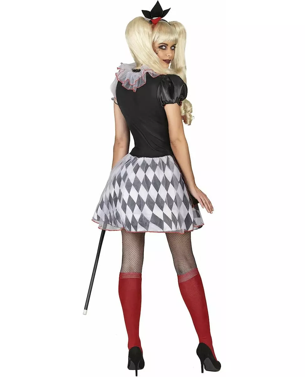 Showets høydepunkt! Dette harlekinkostymet for kvinner inkluderer en kjole, en krage og et hodeplagg. Den korte kjolen er laget asymmetrisk. Rødt, svart, et svart-hvitt sjakkbretttrykk og tyll veksler for å skape denne unike effekten. Skjørtet er laget av satengstoff og fôret med paljettyll på toppen. Tips: For mer volum, ikke nøl med å bruke et underskjørt (selges separat). Den elastiske kragen er laget av hvit tyll med en rød kant og går rundt halsen som et halskjede. Til slutt er hodeplagget et svart plastpannebånd toppet med en tykk filtkrone med et rødt og svart-hvitt rutete trykk. Dette sexy og uvanlige settet vil være perfekt for å være en pen harlekin på en utkledningsfest med venner!. Inkludert tilbehør: Kjole Hodeplagget Krage
